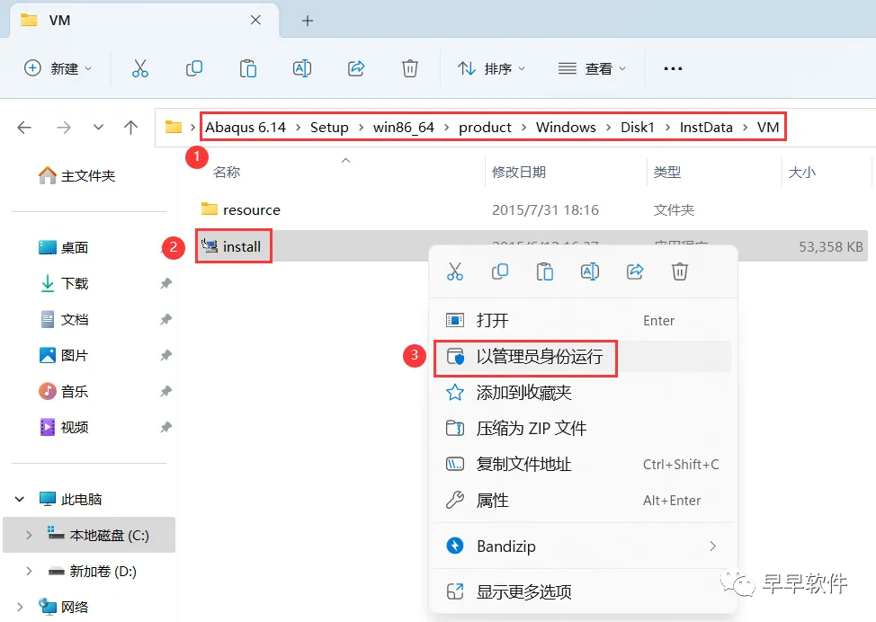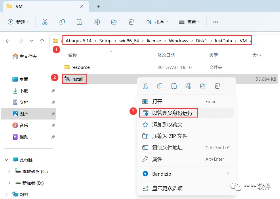 38、回到如图安装包的【VM】文件夹,找到【install】应用程序,右键选择【以管理员身份运行】它