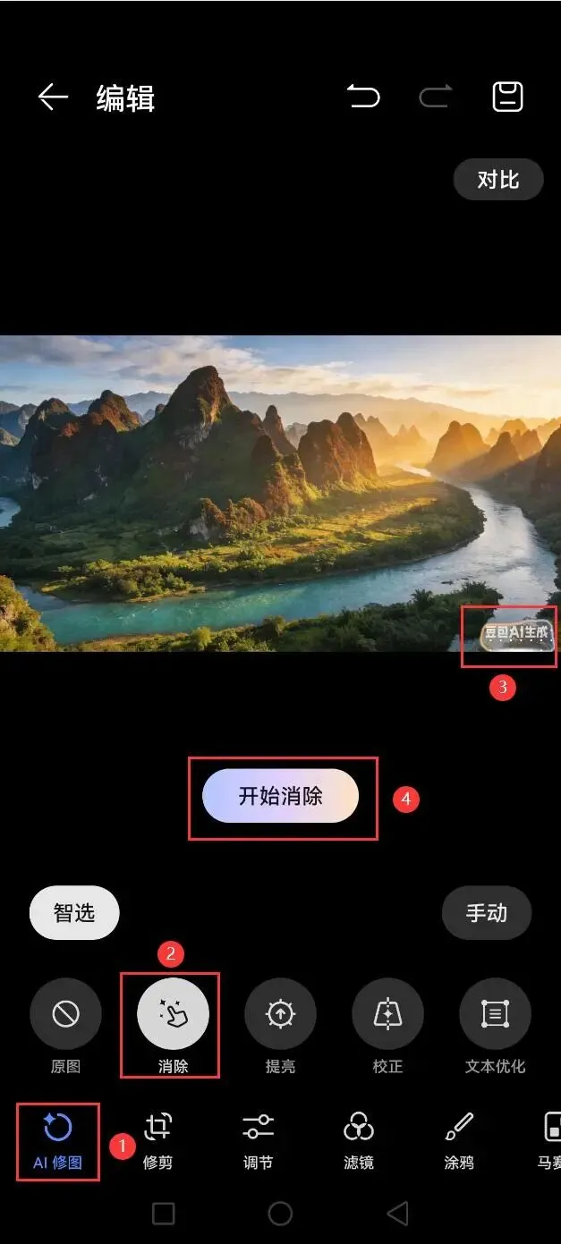选中手机相册中的一张图片进行编辑->AI修图->消除->涂抹需要去水印的区域->点击开始消除;(不同手机步骤可能不太一样)