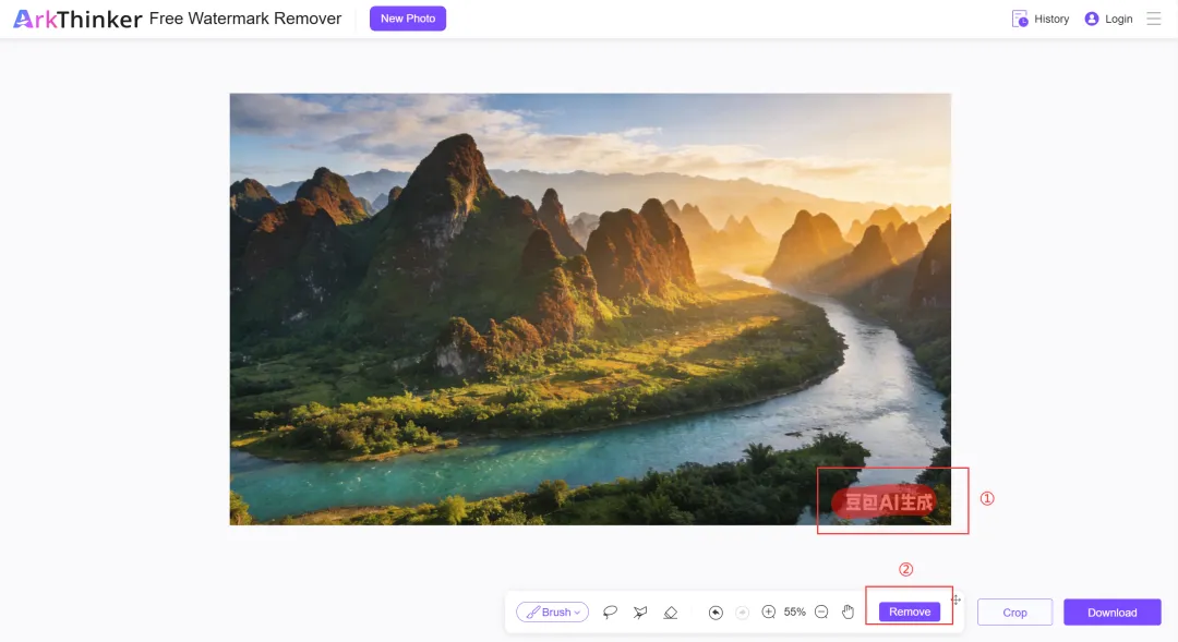 【亮点】免费,用于消除图片水印。(不注册登录的话只能处理分辨率小于1920*1920的图片,同时下载的图片品质也会被降低。)(1)登录ArkThinker后,点击Upload image上传图片;(2)用画笔涂抹需要去水印的区域,点击Remove消除;
