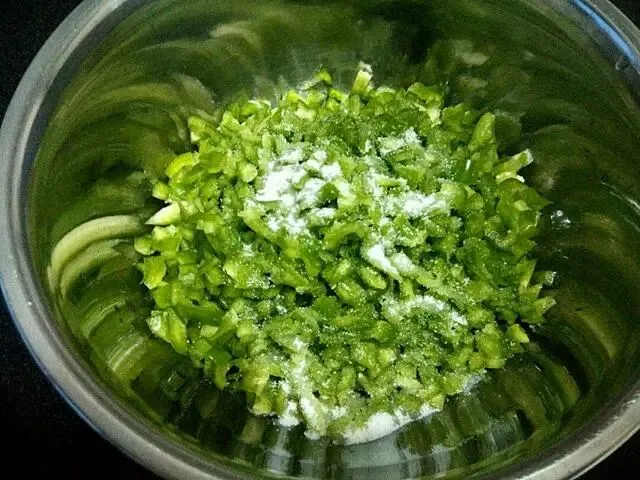 2、 辣椒掰开去掉里面的籽,洗净之后切成丝,再切成下面图片中的这种小粒,尽量碎一些,切好之后放到盆中,加一小勺的盐,将它们搅拌均匀。