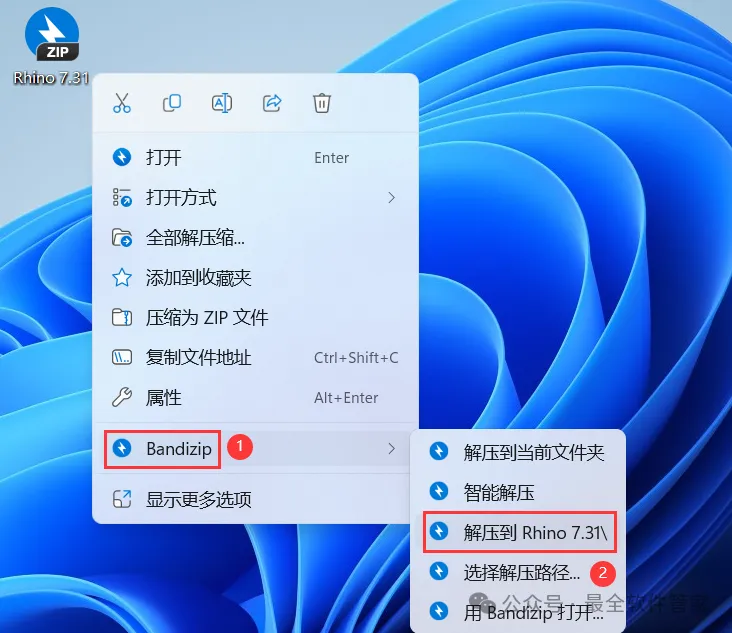 1、下载Rhino 7.31软件安装包到电脑上,右键选择【解压到Rhino 7.31\】