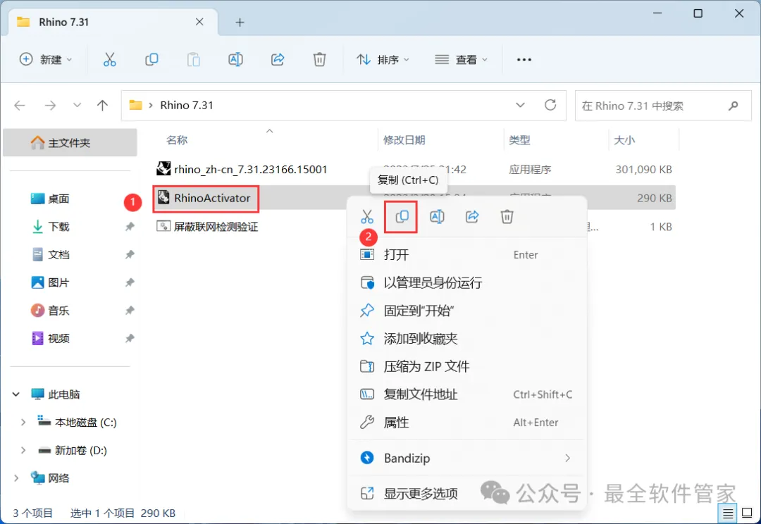 10、回到Rhino 7.31文件夹,找到【RhinoActivator】程序,再右键点击【复制按钮】