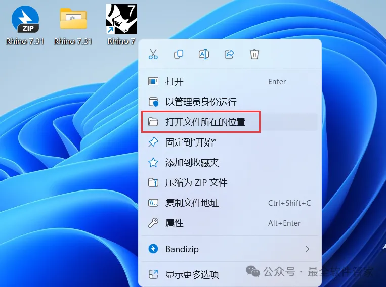 11、回到桌面,右键桌面上的【Rhino 7软件图标】,点击【打开文件所在的位置】