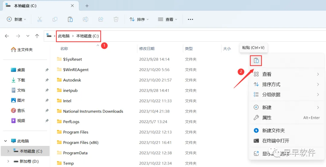 4、打开本地C盘,再右键文件夹的空白处,点击【粘贴按钮】