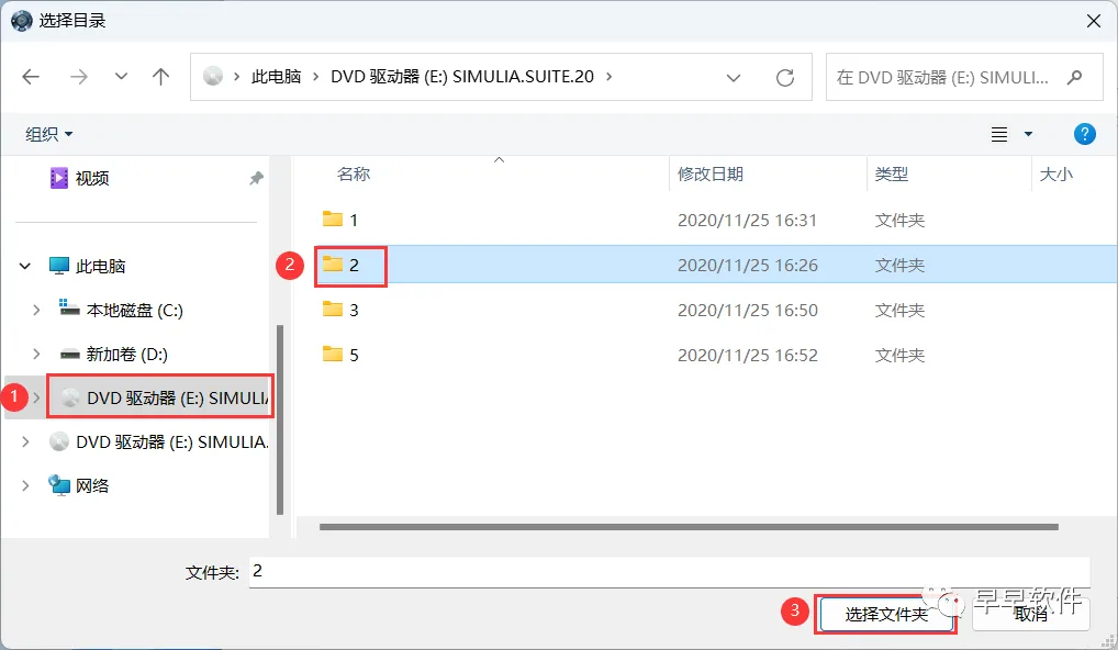 22、点击左侧的【DVD驱动器】,点击【2】文件夹,再点击【选择文件夹】