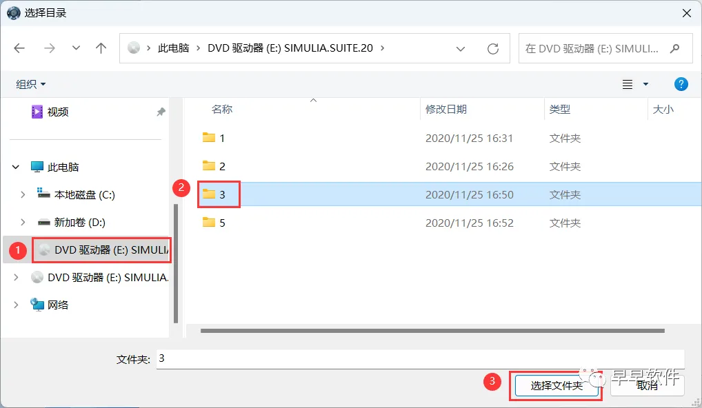 36、点击左侧的【DVD驱动器】,点击【3】文件夹,再点击【选择文件夹】