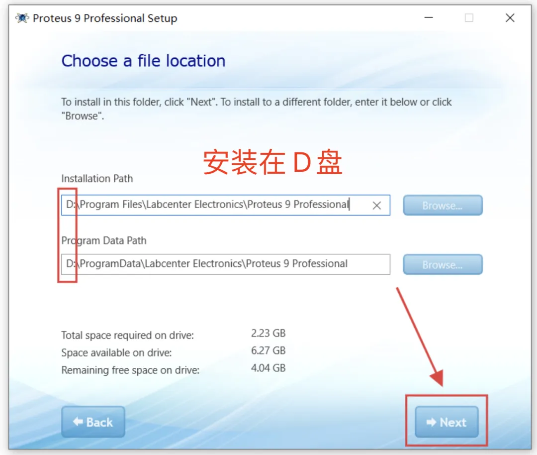 8.修改安装路径:将地址栏首字符C改成D,使程序安装到D盘,然后点击:Next,请记住安装位置,后面激活步骤需要。安装地址不要含有中文等特殊字符。