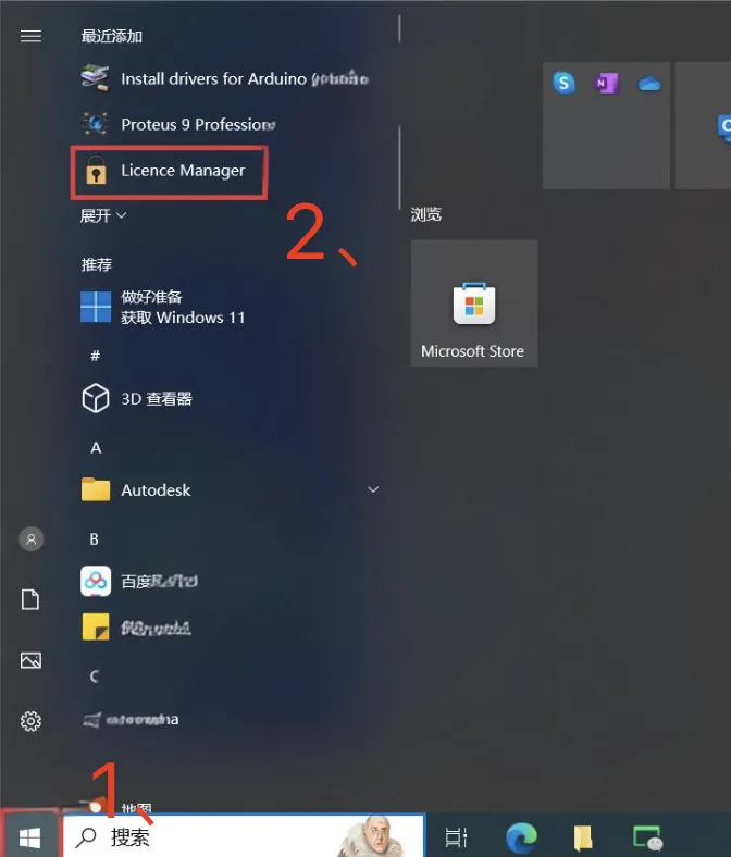 13.点击开始图标 > 所有应用 > 展开:Proteus 9 Professional,文件夹,点击:Licence Manager。