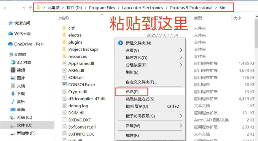 20.打开安装位置:D:\Program Files\Labcenter Electronics\Proteus 9 Professional\Bin,粘贴文件。每个人安装地址可能不同。