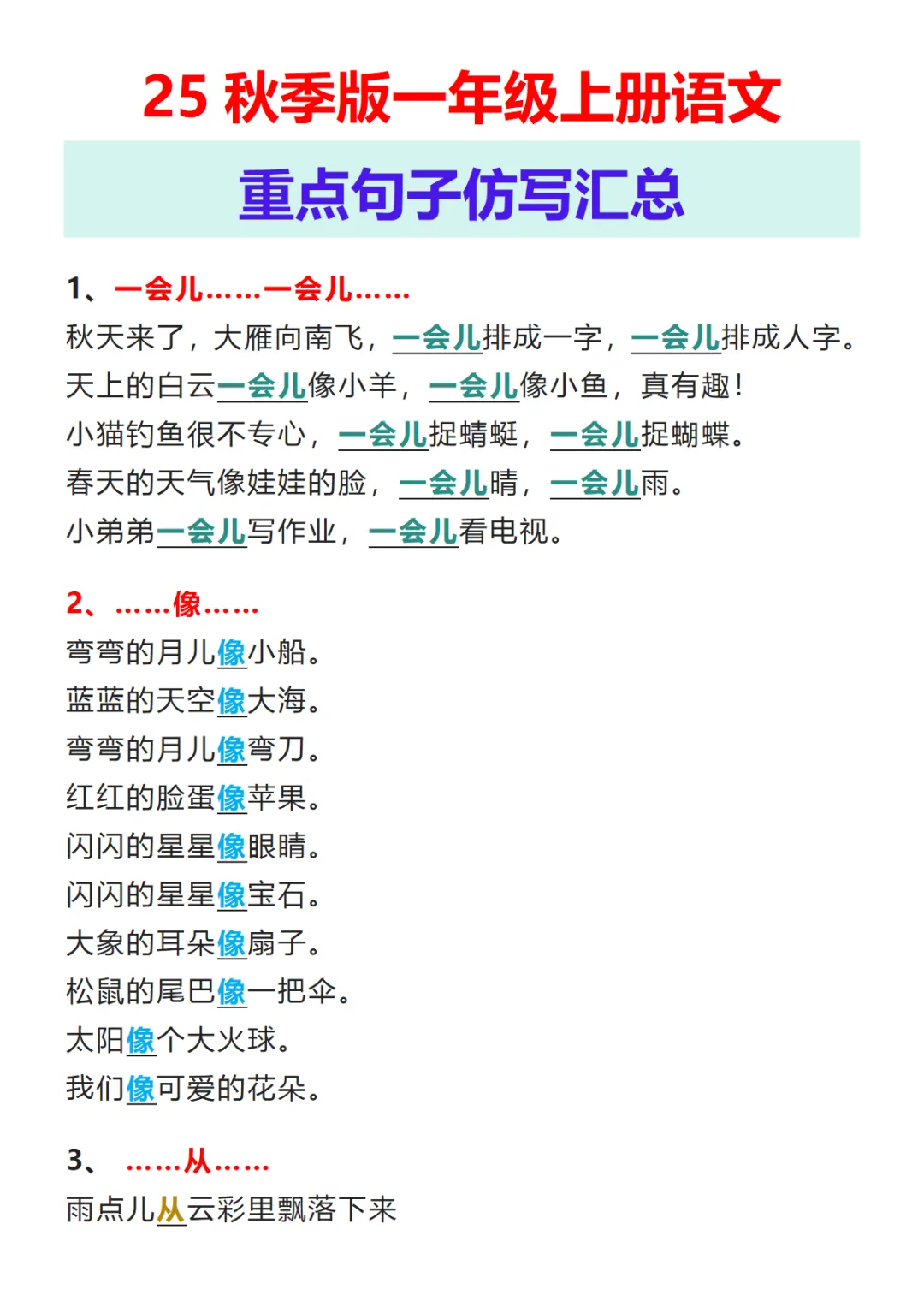 【2025秋新版】一年级上册语文重点句子仿写汇总