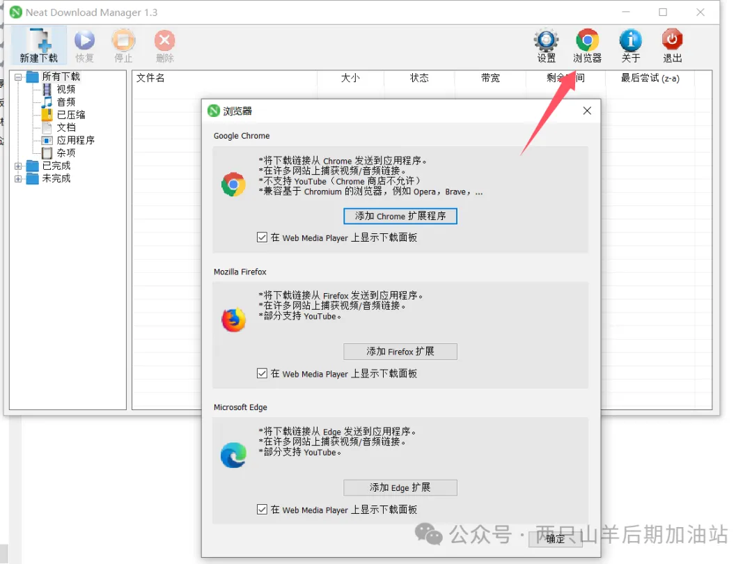 NDM在用户体验上力求与IDM并驾齐驱,甚至在某些细节处理上更胜一筹,完全可以作为IDM的优质替代品。它不仅继承了IDM快速稳定的下载能力,更在功能细节上进行了深度优化。例如,它内置了强大的网页内容嗅探功能,能够一键识别并下载网页中的视频、音频等多媒体资源,极大地提升了用户的下载便捷性。不过,安装插件需要跳转到应用商店里,这个过程需要使用魔法的,不想使用魔法安装的小伙伴,也不用担心,这里山羊已经提前帮大家准备好了插件,免去了用魔法的麻烦。在下载速度方面,NDM同样表现出色。它支持对单个文件进行多线程分割下载,通过将大文件细分为多个小块并行下载,有效缩短了整体下载时间,极大地提升了下载效率。据实测,NDM在最佳状态下能够支持高达32条下载线路,最快下载速度可飙升至惊人的108MB/s,这在免费下载工具中无疑是天花板级别的存在。