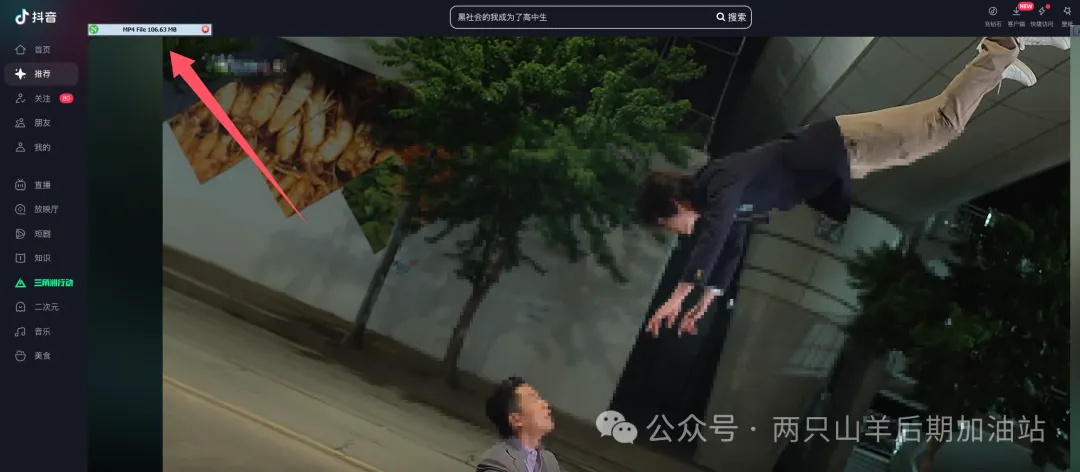 插件装好后,在网页上播放视频的时候,它就会自动在页面左上角嗅探出媒体文件,点一下,视频就能飞快地下载到本地了,注意:视频文件和音频文件是分开下载,文件大的是视频,文件小的是音频。下图是山羊测试的抖音视频