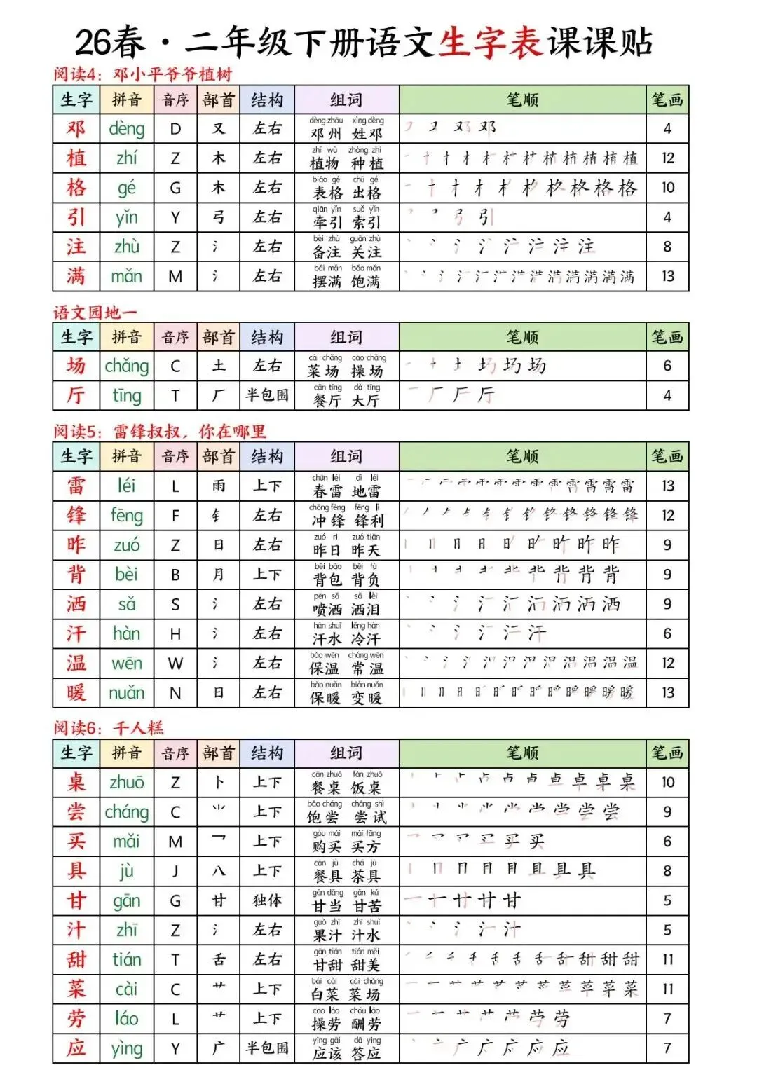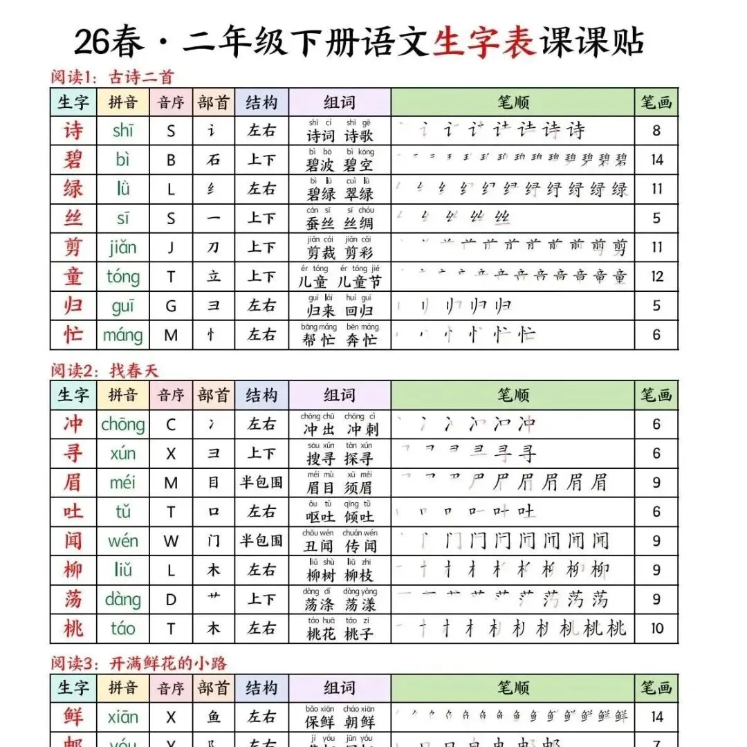 大家好,今天为大家分享2026春二年级下册语文生字表课课贴电子版资料。这份精心整理的学习资料按照教材章节编排,包含每个生字的规范书写示范和拼音标注,是孩子预习和复习的必备神器。