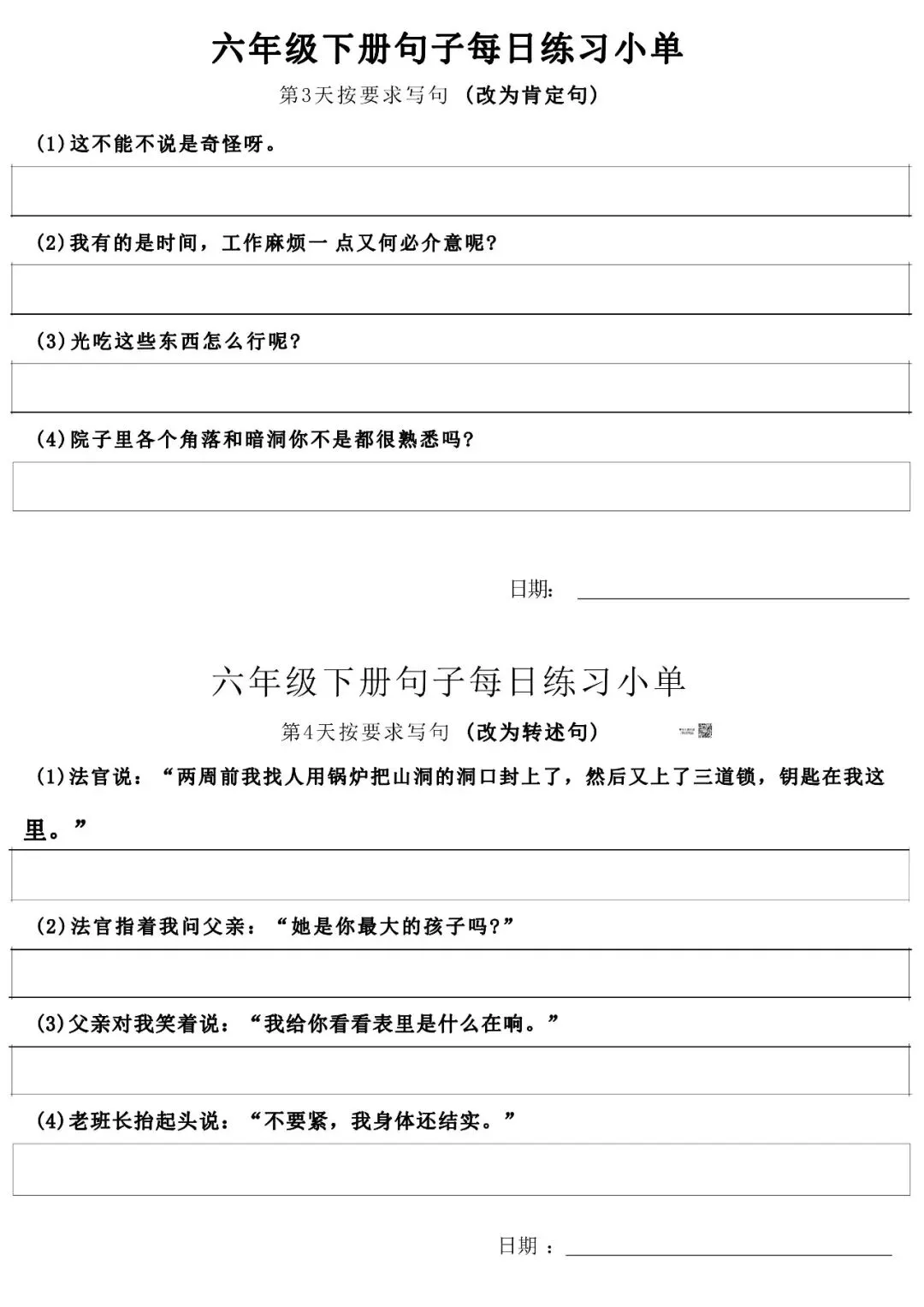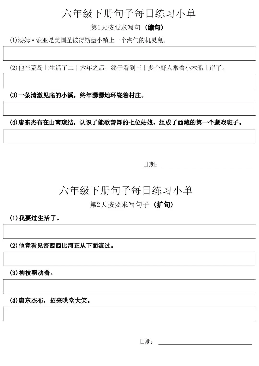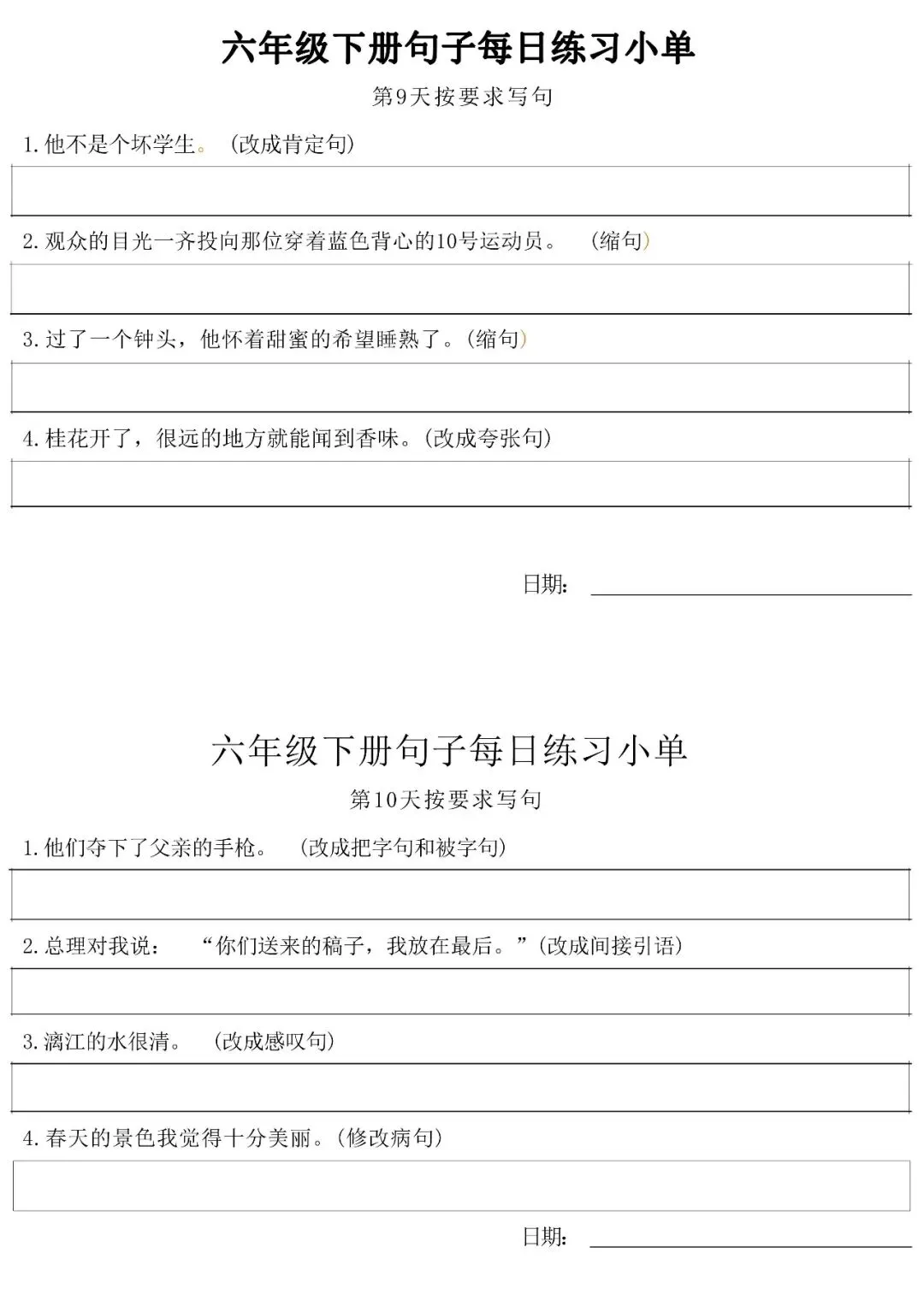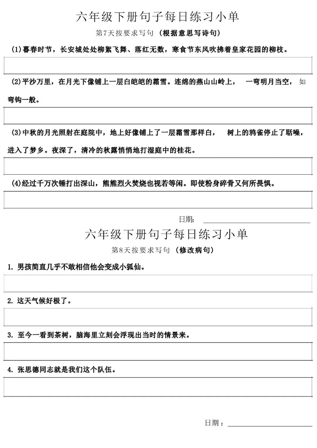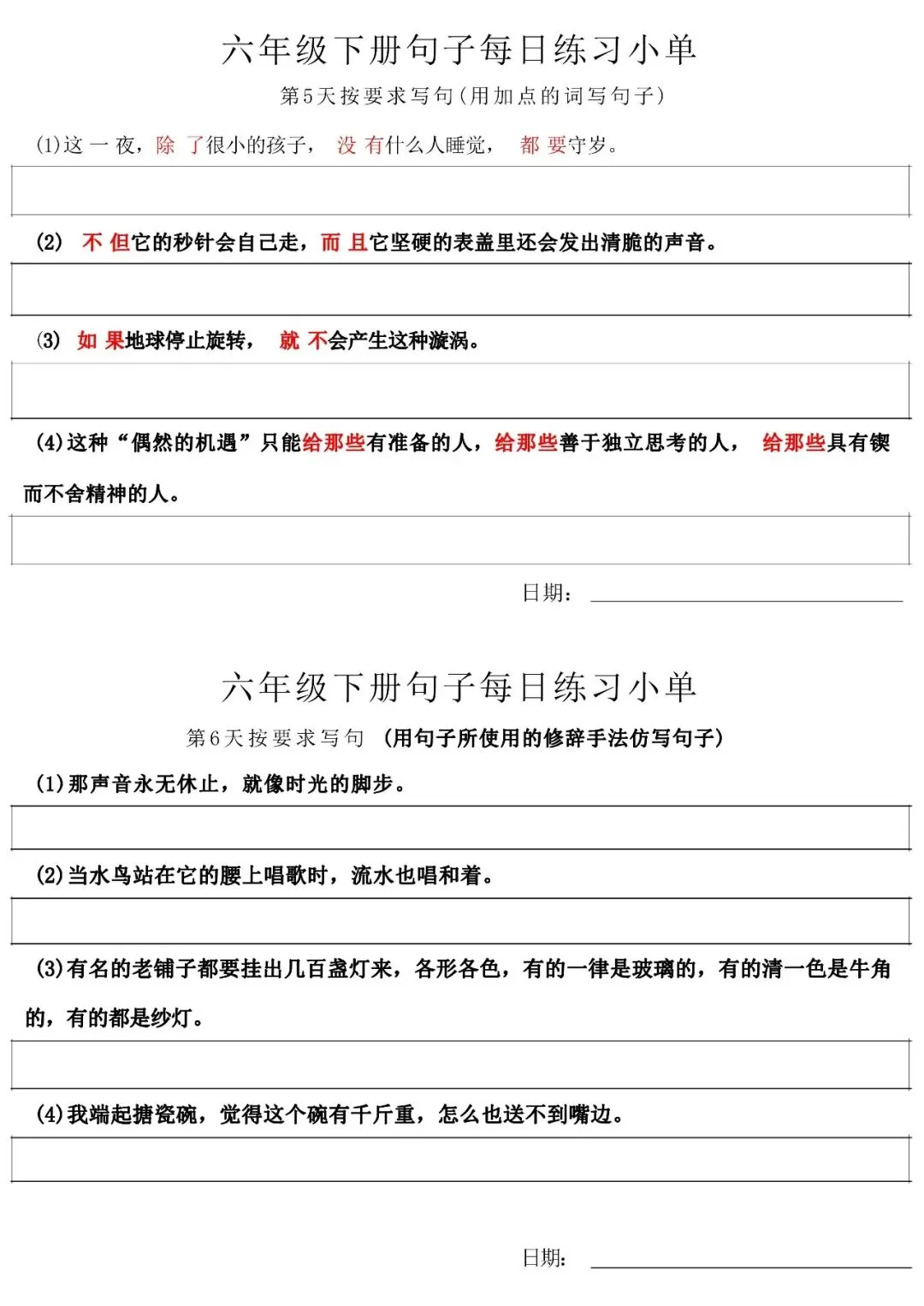 当前位置:首页>免费下载>小学六年级语文下册每日句子练习单 可免费下载打印