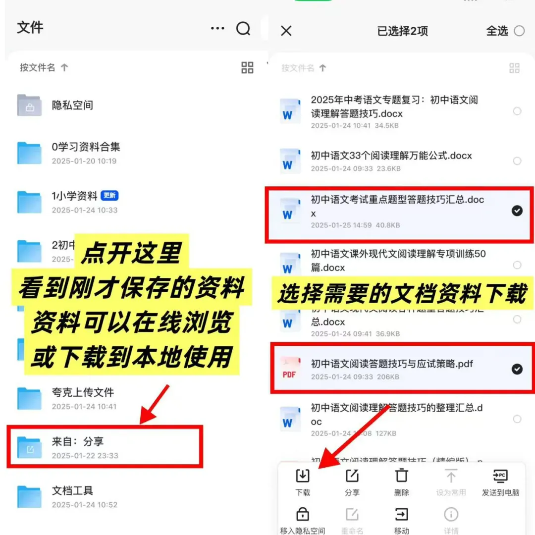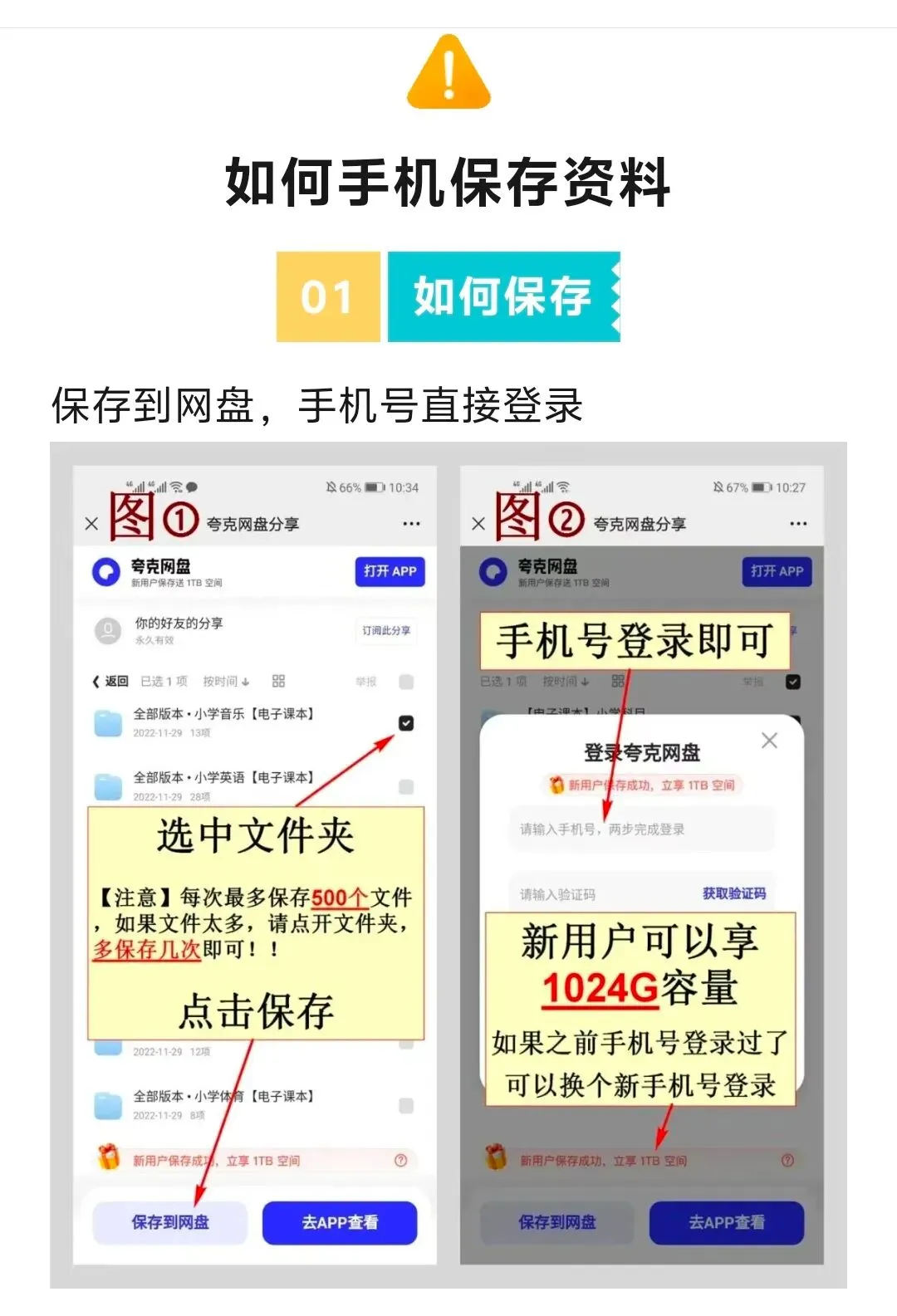 1.保存资料到网盘:通过文章中的链接打开分享内容,选中需保存的资料文件夹,点击“保存到网盘”,用手机号登录即可完成保存。