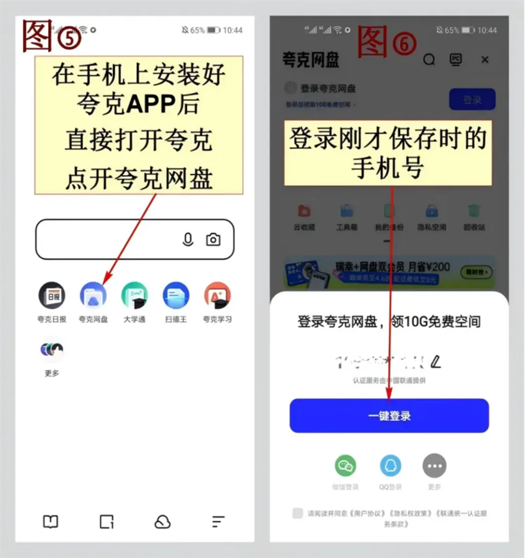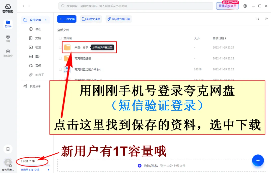 3.登录夸克网盘:打开安装好的夸克APP,用之前保存资料时使用的手机号登录,登录后还可额外领取1T 免费空间(须新用户+手机号注册)