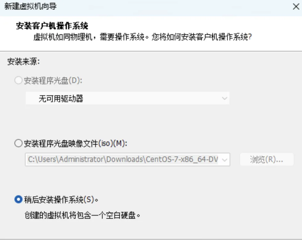 3、选择:自定义配置,并选择:稍后安装操作系统