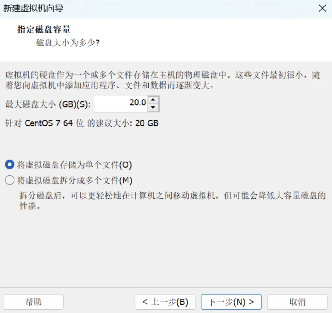 分配 20GB 磁盘空间,选择:将虚拟磁盘存储为单个文件,以获得更好性能