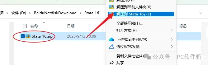 1.解压安装包:鼠标右击【Stata 16.0 】压缩包,选择电脑上安装的解压软件,点击【Stata 16.0 】。