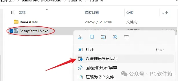 3.右键以管理员身份运行【SetupStata16.exe】安装程序。