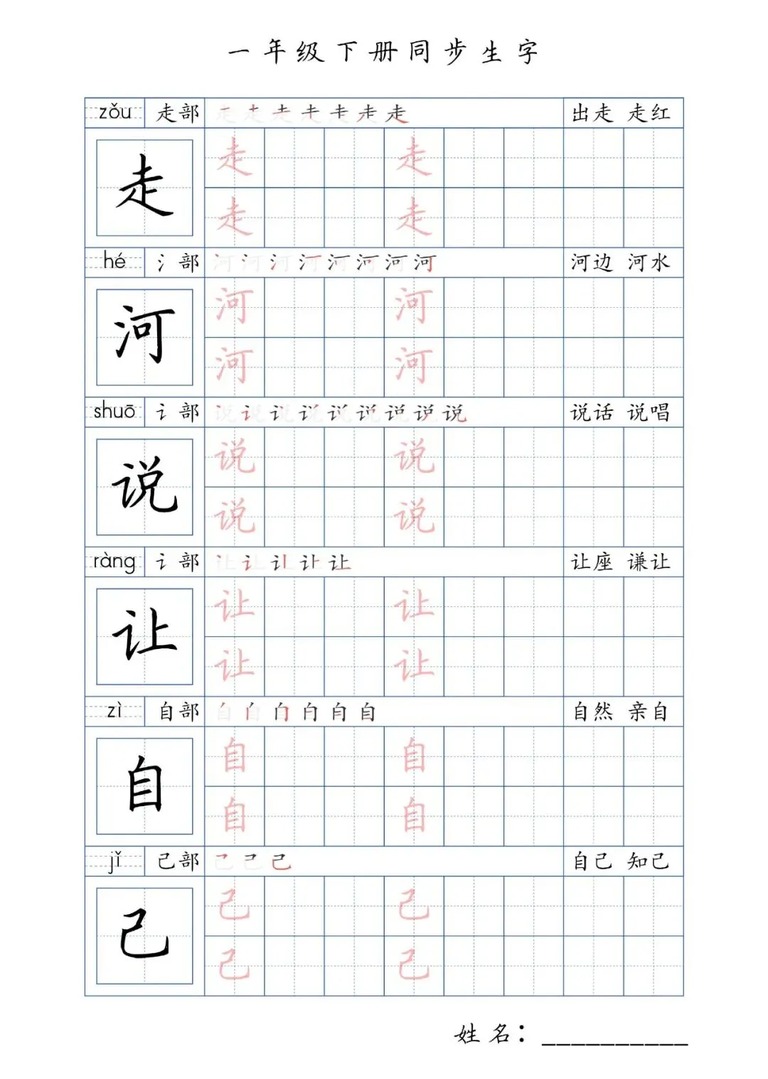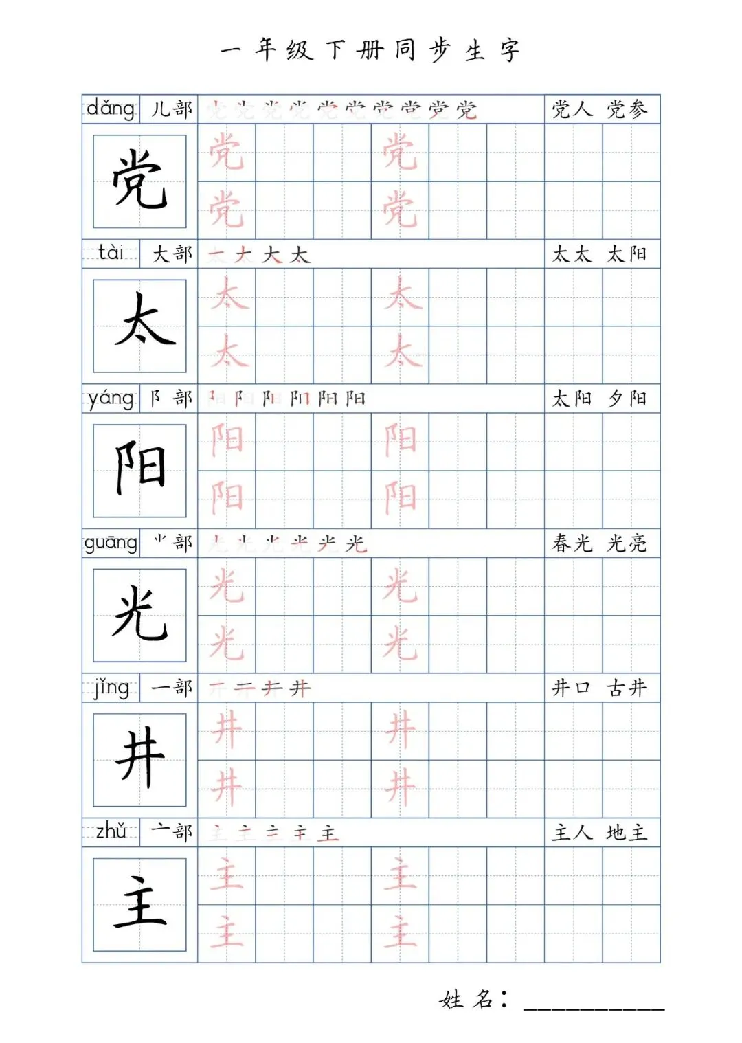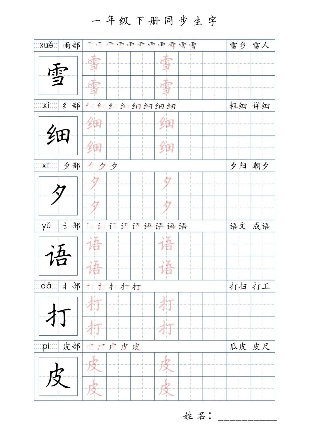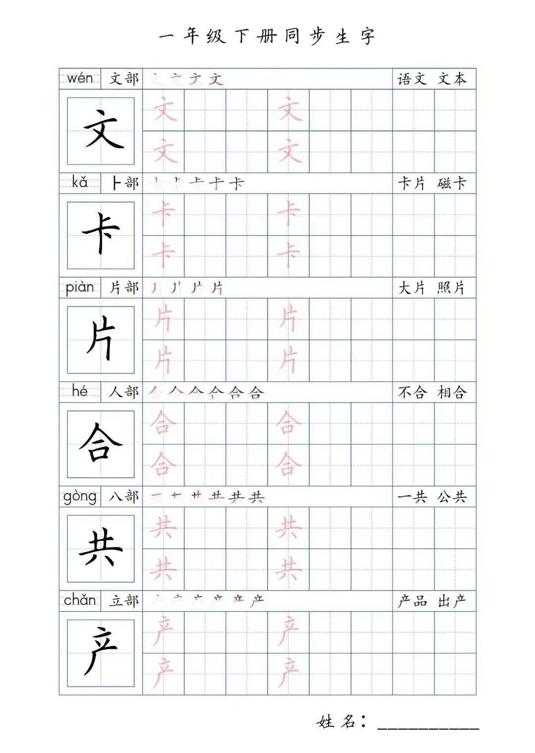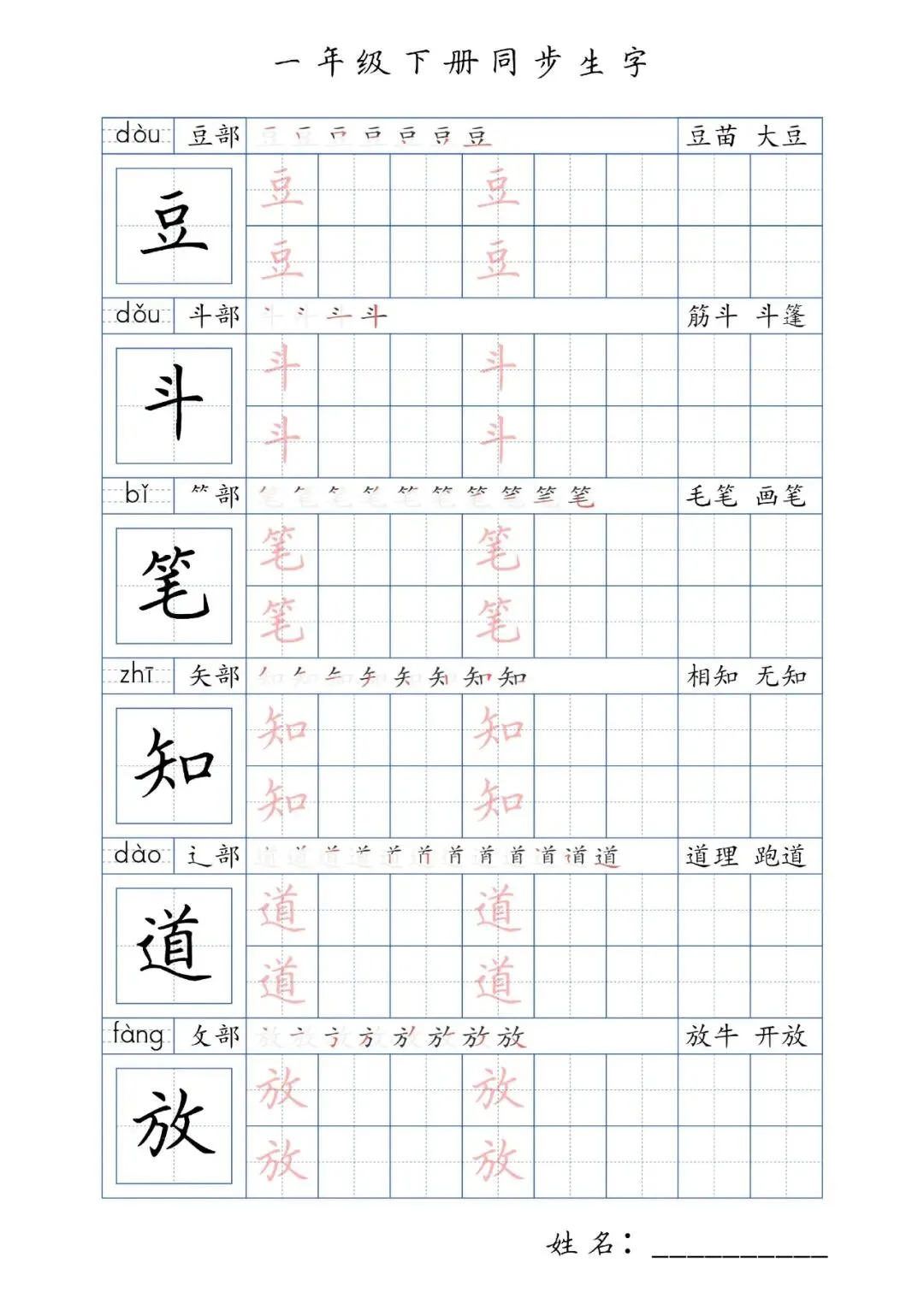 同步生字一年级下册,PDF免费下载