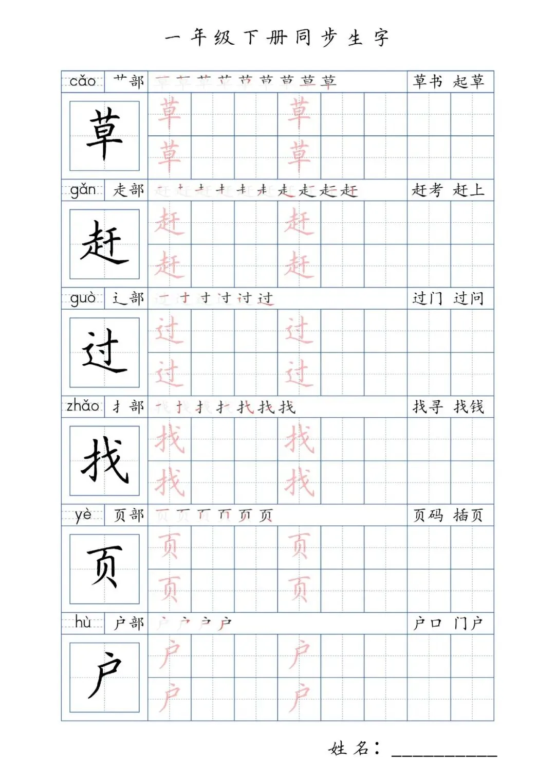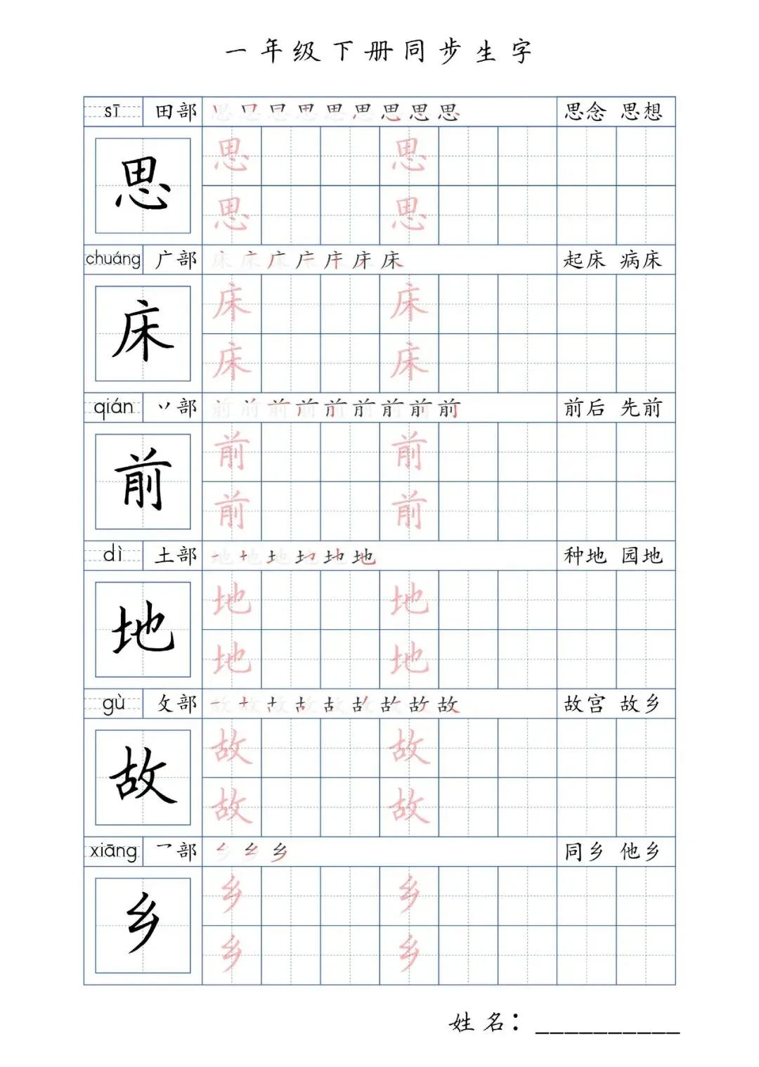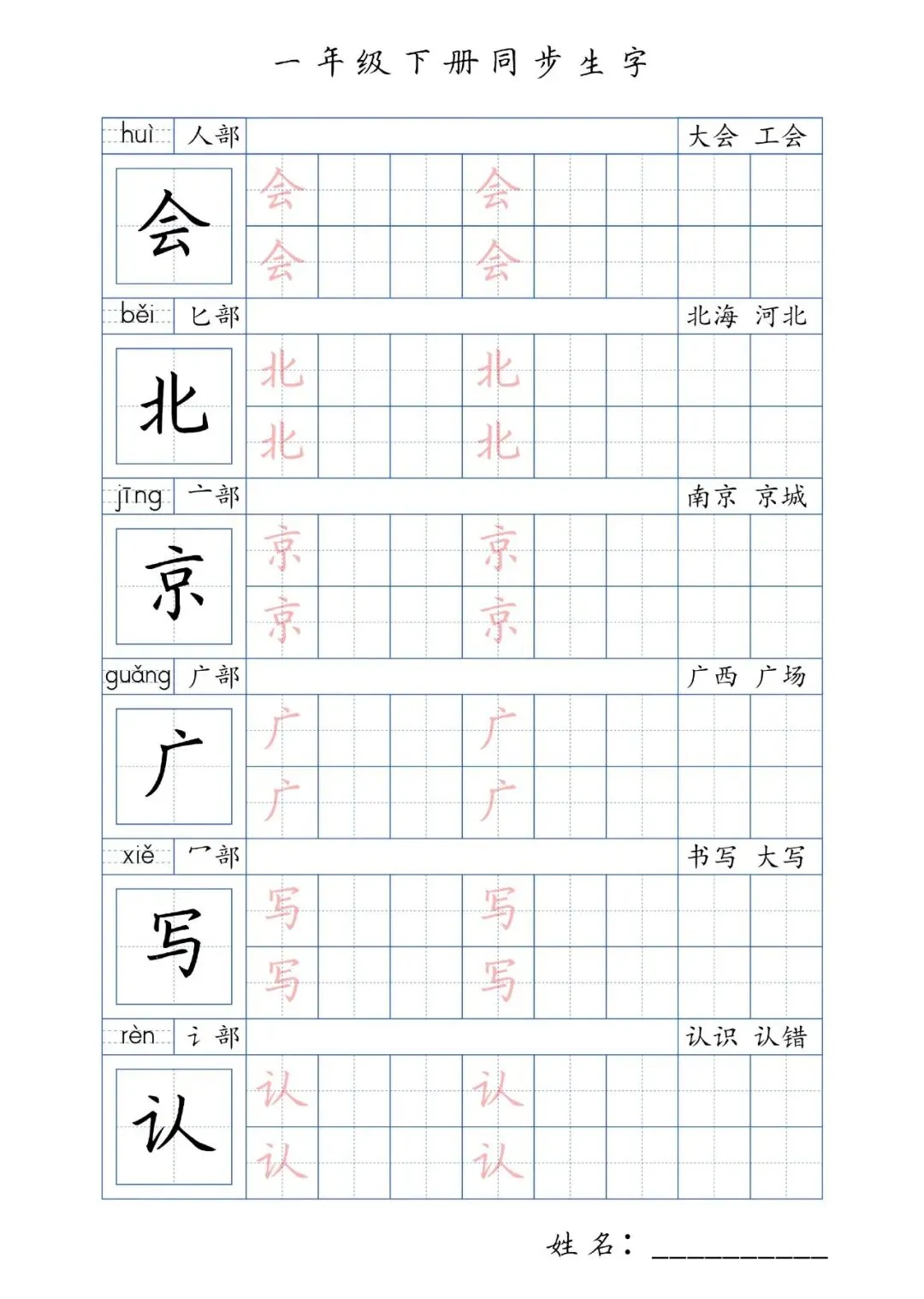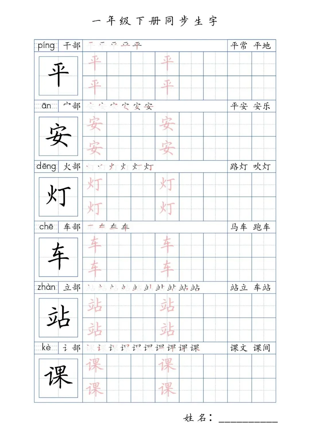 同步生字一年级下册,PDF免费下载