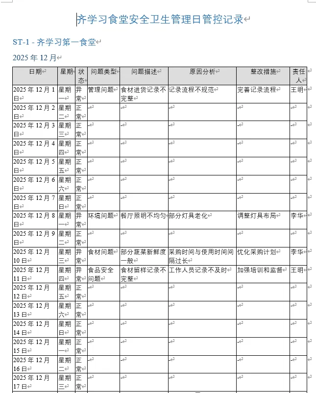 >学校食堂日管控周排查月调度记录模板附免费下载链接