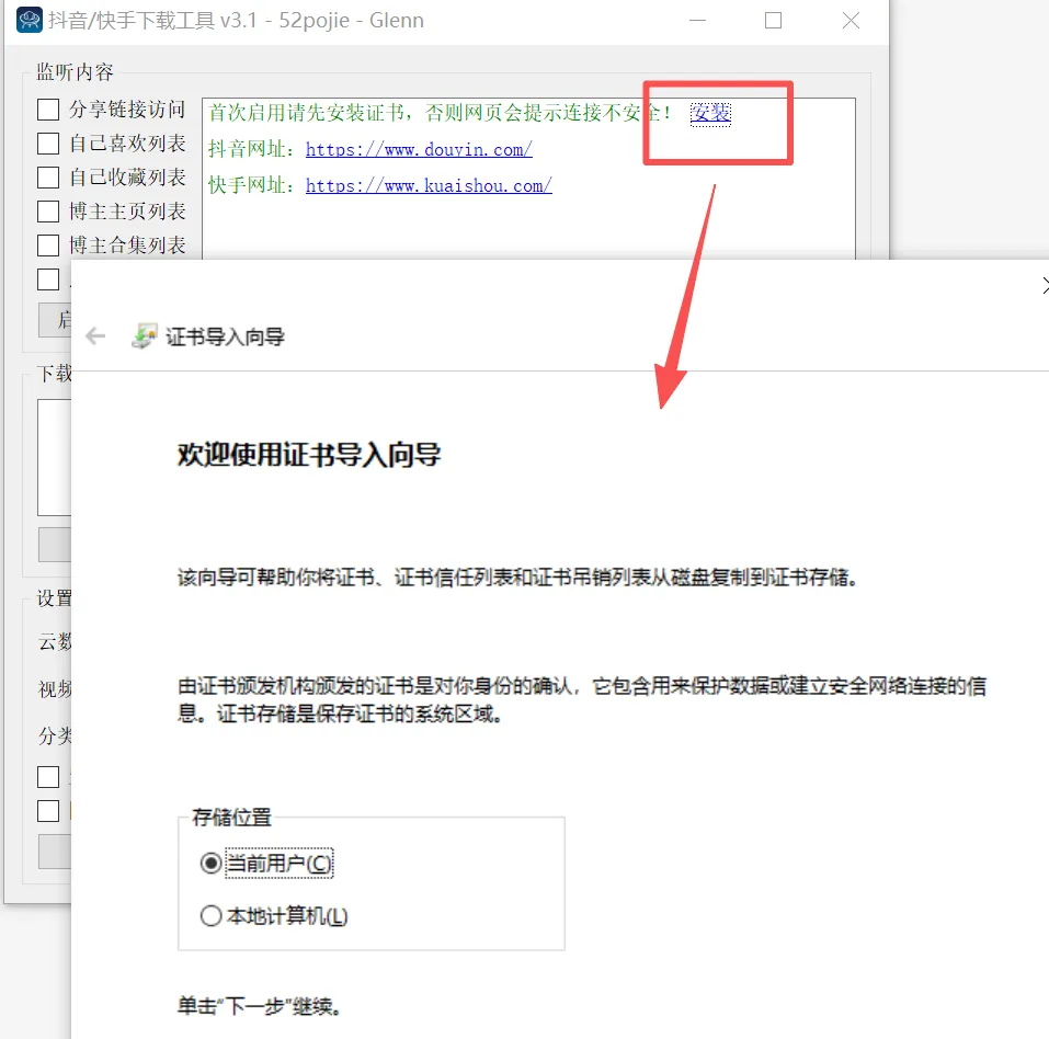 第一步需要先点击“安装”,在本地电脑安装一个证书,否则监听不了,安装证书时一直下一步就可以。