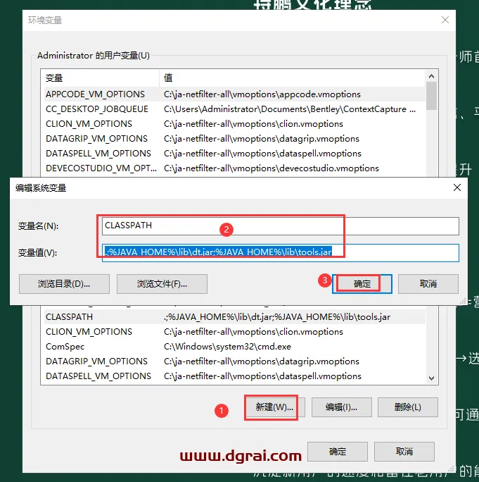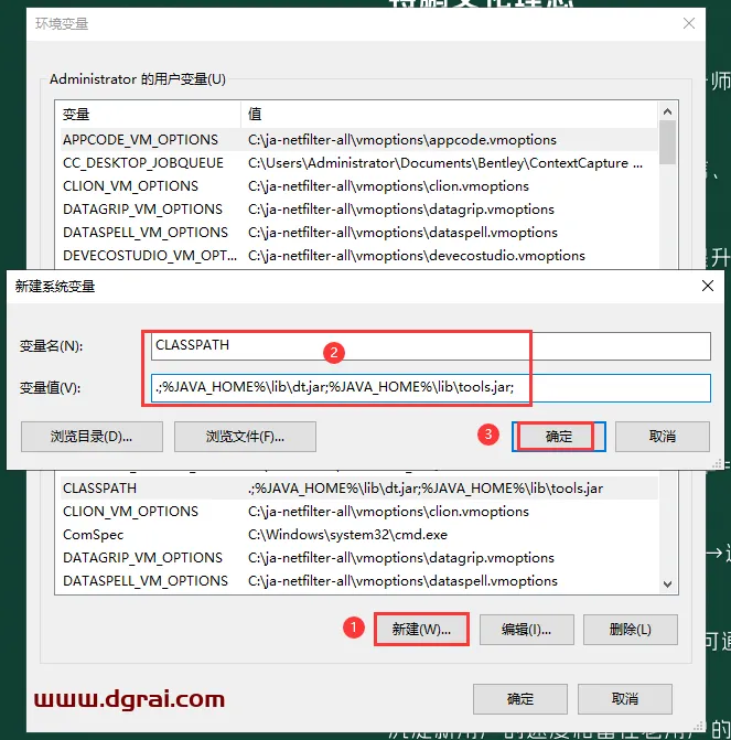 再点击新建,输入变量名:【CLASSPATH】变量值 【.;%JAVA_HOME%\lib\dt.jar;%JAVA_HOME%\lib\tools.jar; 】,然后点击确定(注意最前面有一点)
