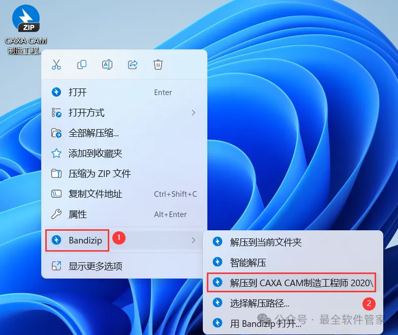 1、下载CAXA CAM制造工程师 2020软件安装包到电脑上,右键选择【解压到CAXA CAM制造工程师 2020\】