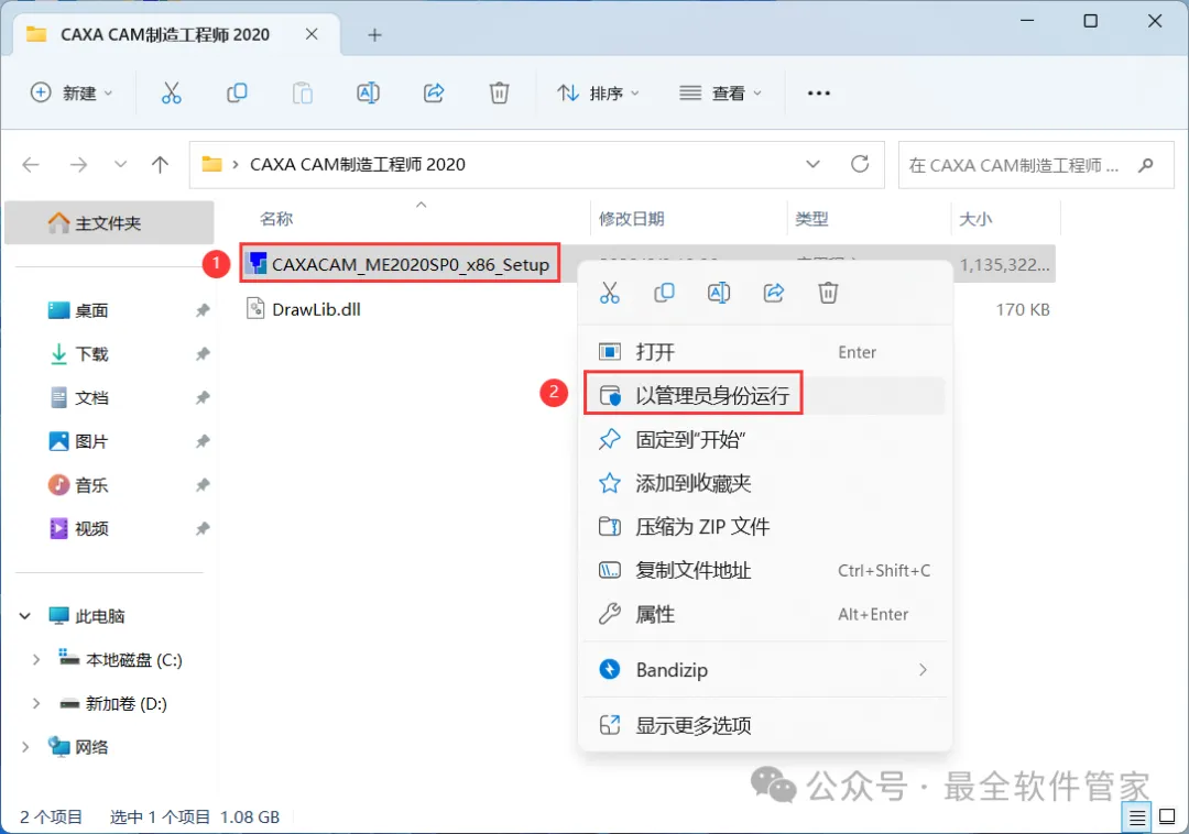3、找到【CAXACAM_ME2020…】应用程序,右键选择【以管理员身份运行】它
