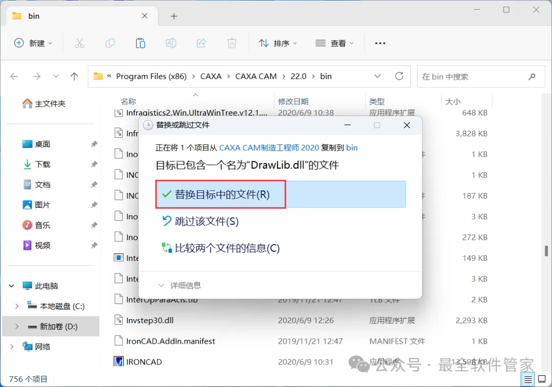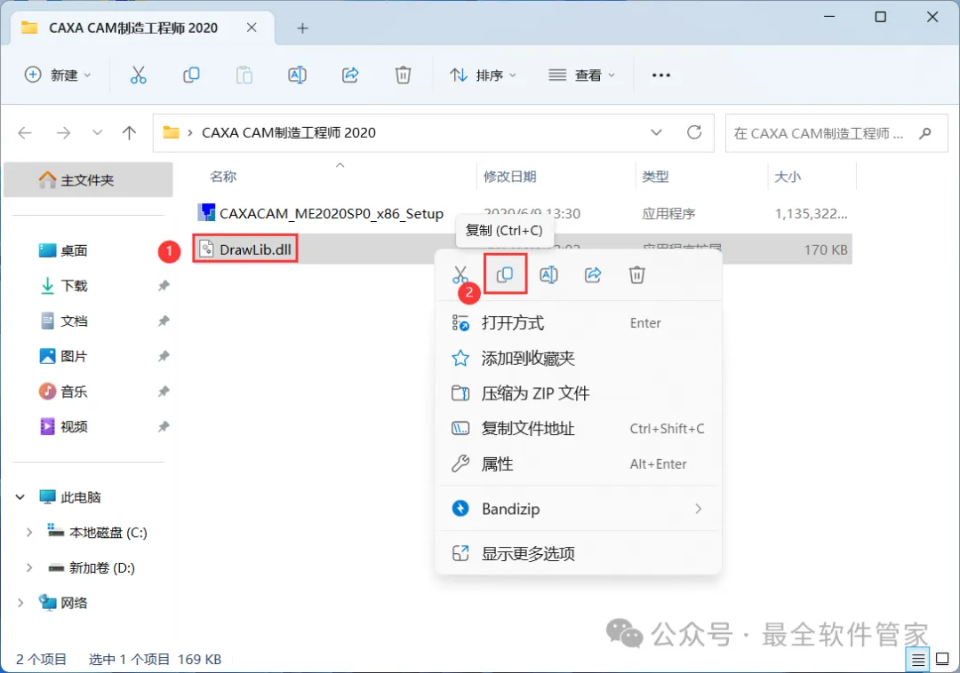 9、回到CAXA CAM数控车 2020文件夹,找到【DrawLib.dll】文件,再右键点击【复制按钮】