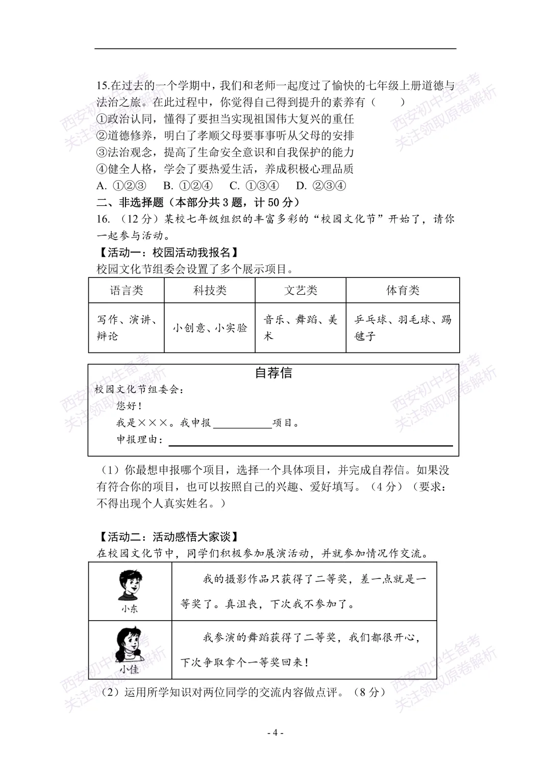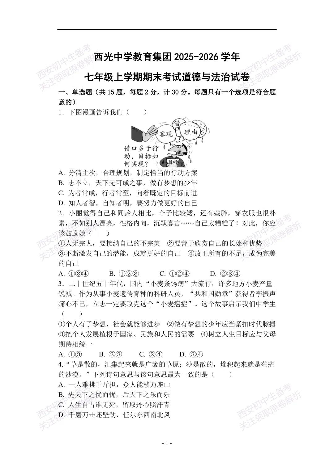 >最新真题,免费下载!西安期末:【25-26西光中学】七上期末考试,道德与法治试题,试卷+完整版答案,!