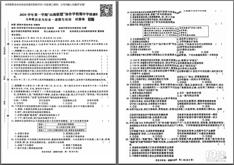 今天为大家准备的是家长上传的浙江山海联盟初中社会的九年级上期中测试卷,获取试卷完整电子版pdf免费下载及参考答案分析请点击文中的小程序!