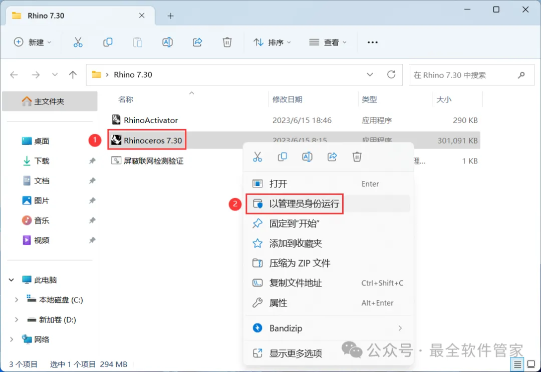 1、下载Rhino 7.30软件安装包到电脑上,右键选择【解压到Rhino 7.30\】