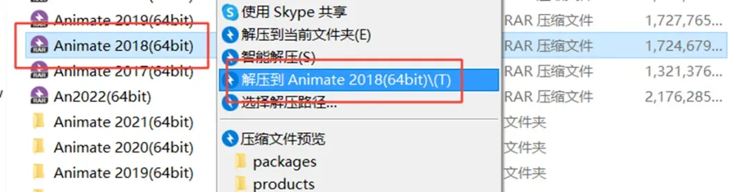 2.鼠标右击【Animate 2018(64bit)】压缩包选择【解压到 Animate 2018(64bit)】