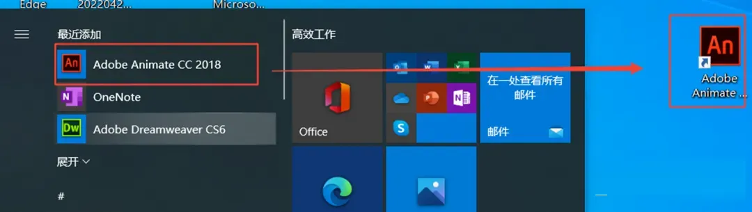 9.创建桌面启动快捷方式:点击桌面左下角【开始】图标,点击【所有应用】→找到并拖动【Adobe Animate CC 2018】图标到电脑桌面