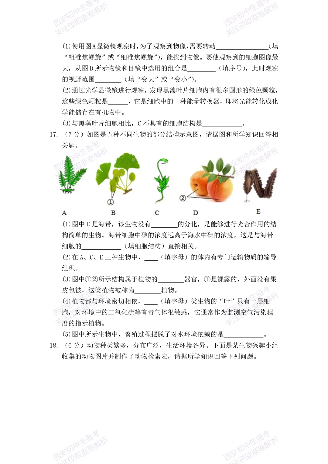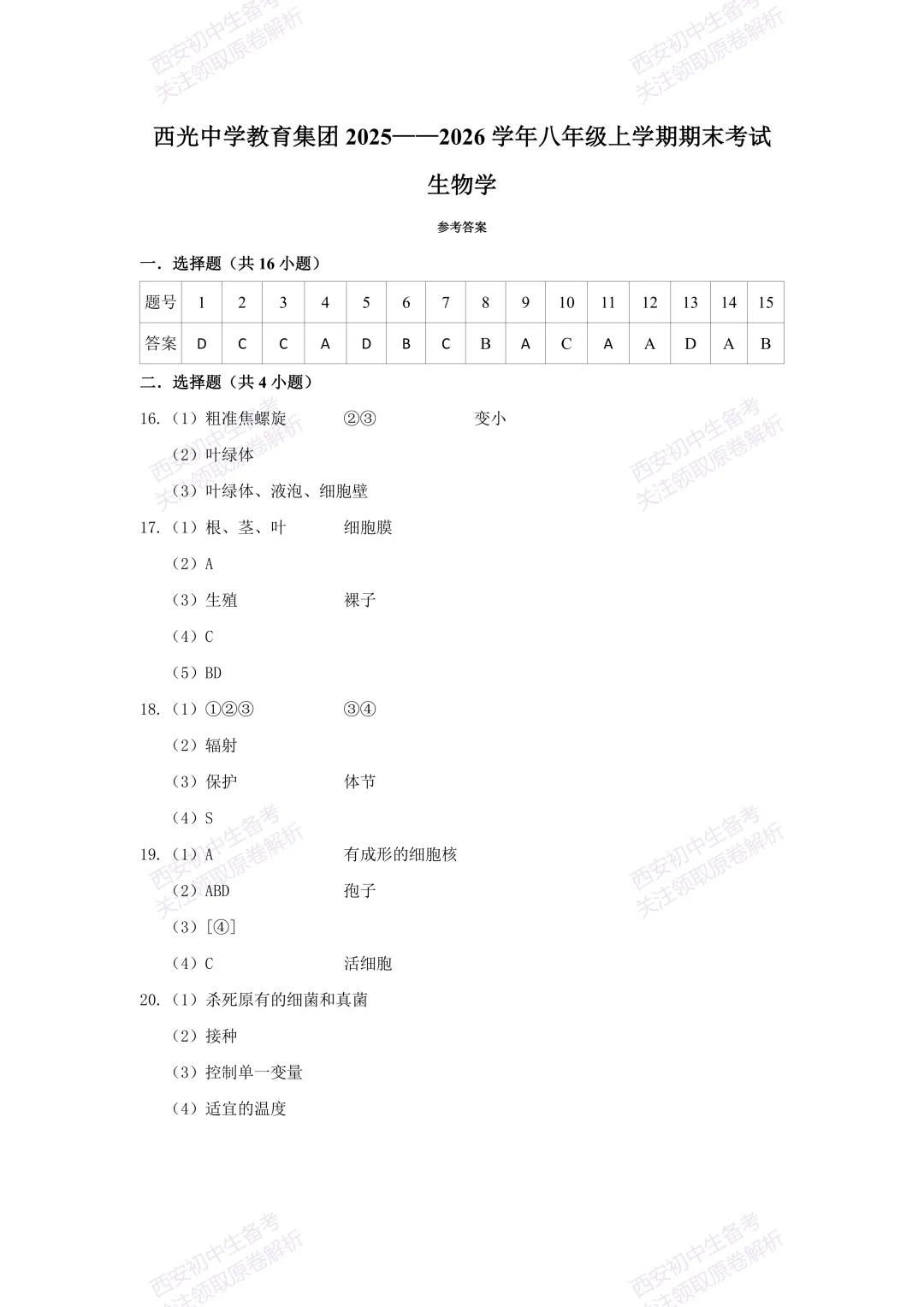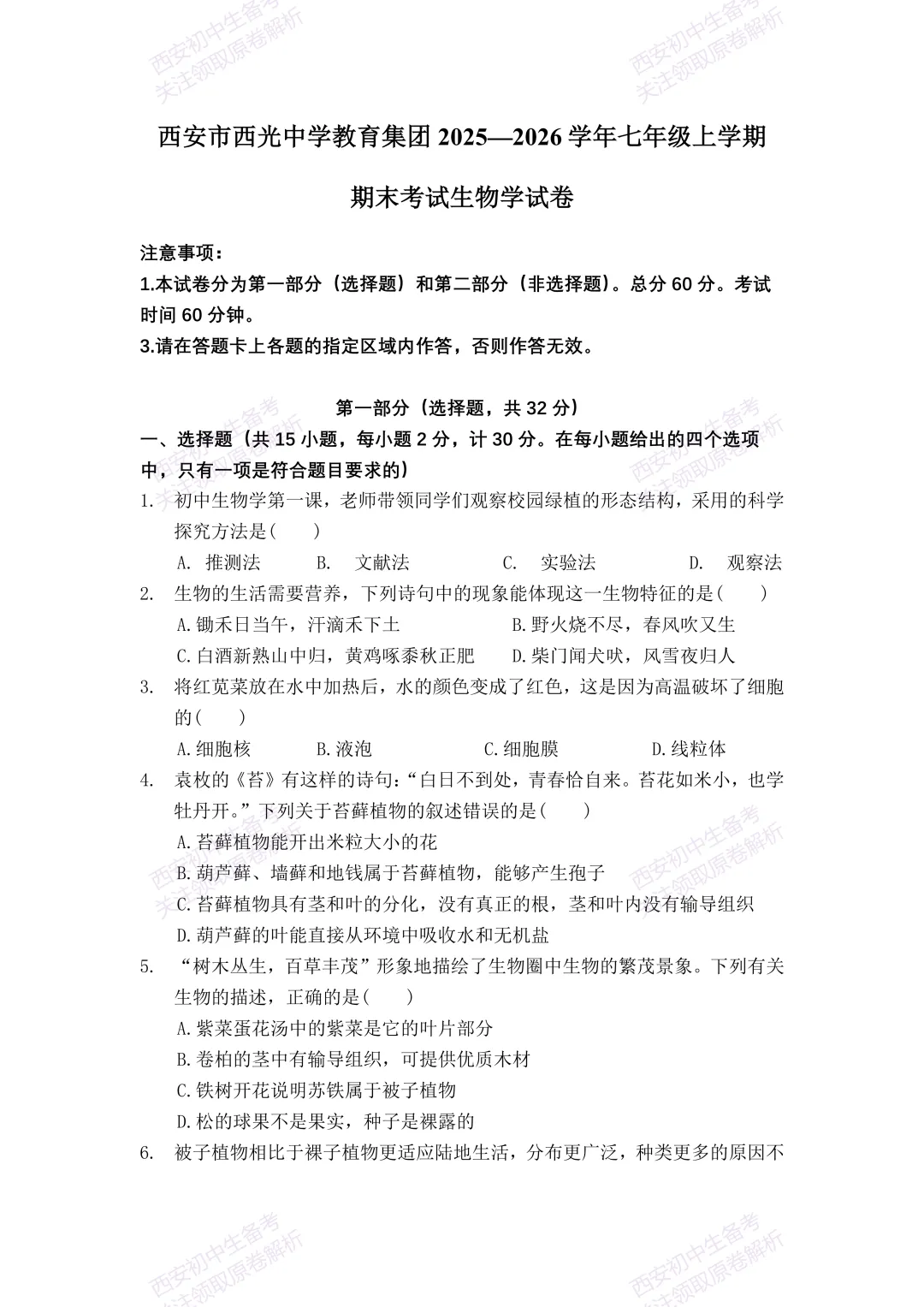>最新真题,免费下载!西安期末:【25-26西光中学】七上期末考试,生物试题,试卷+完整版答案,!