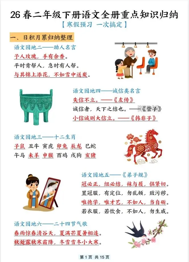 今天给大家整理了26春二年级语文下册全册重点知识归纳,转发给朋友或班级群,受益更多人,帮助孩子学习!
