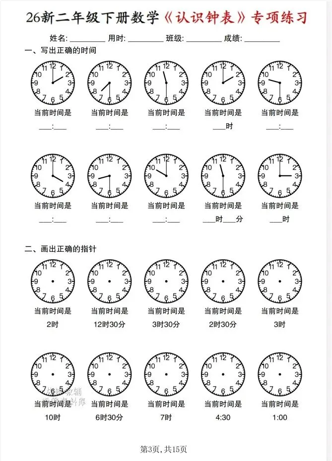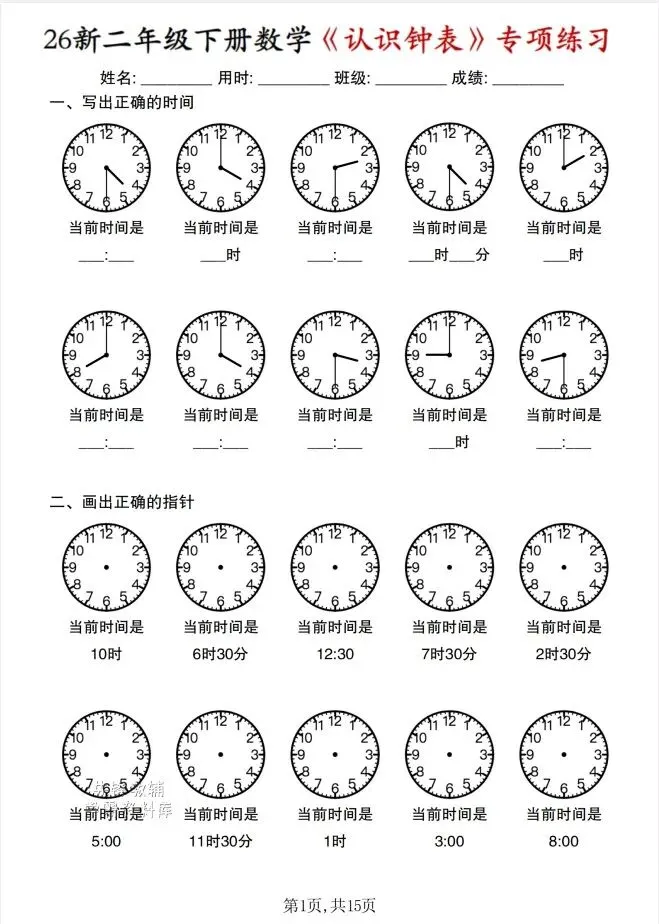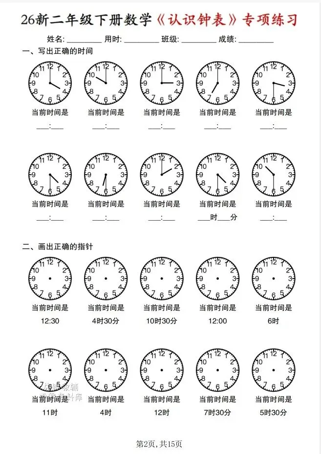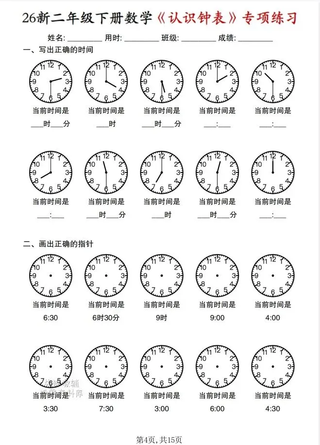 今天给大家整理了26春 二年级数学下册《认识钟表》专项练习,转发给朋友或班级群,受益更多人,帮助孩子学习!