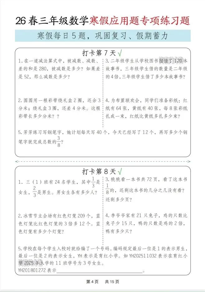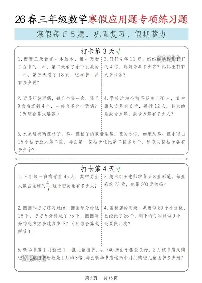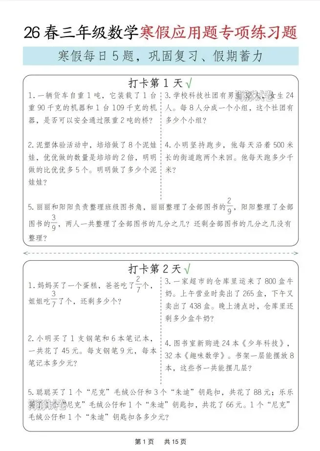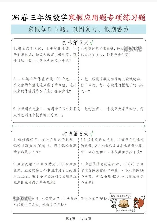 今天给大家整理了26春三年级数学寒假应用题专项练习题,转发给朋友或班级群,受益更多人,帮助孩子学习!