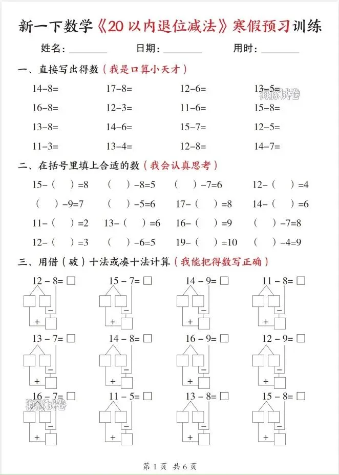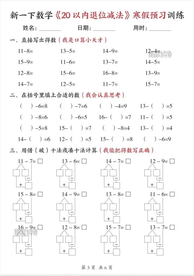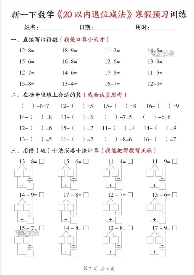今天给大家整理了新一年级数学下册20以内退位减法寒假预习训练,转发给朋友或班级群,受益更多人,帮助孩子学习!