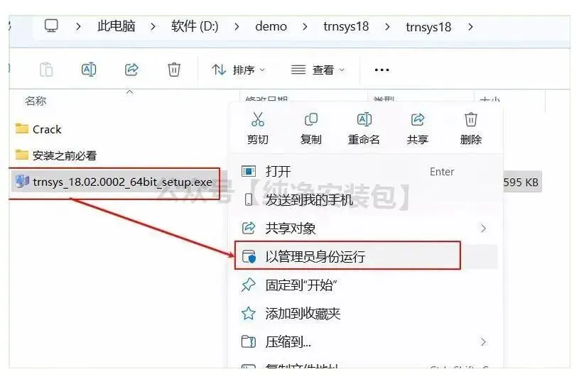 ② 在解压出来的文件夹中,找到"trnsys_18.02.0002_64bit_setup.exe",这个就是我们需要的安装程序。重要的是,一定要右键选择"以管理员身份运行"!