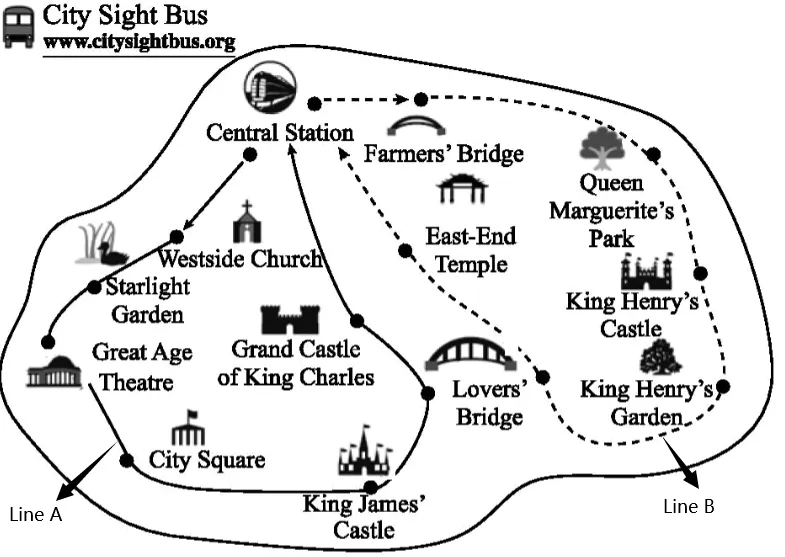 Welcome to our City! Do you want to have a great time, but you are tired of route (路线) planning? If so, we have a city sight bus for you! The following map includes two lines which cover all the sights in our city. Come and have fun!