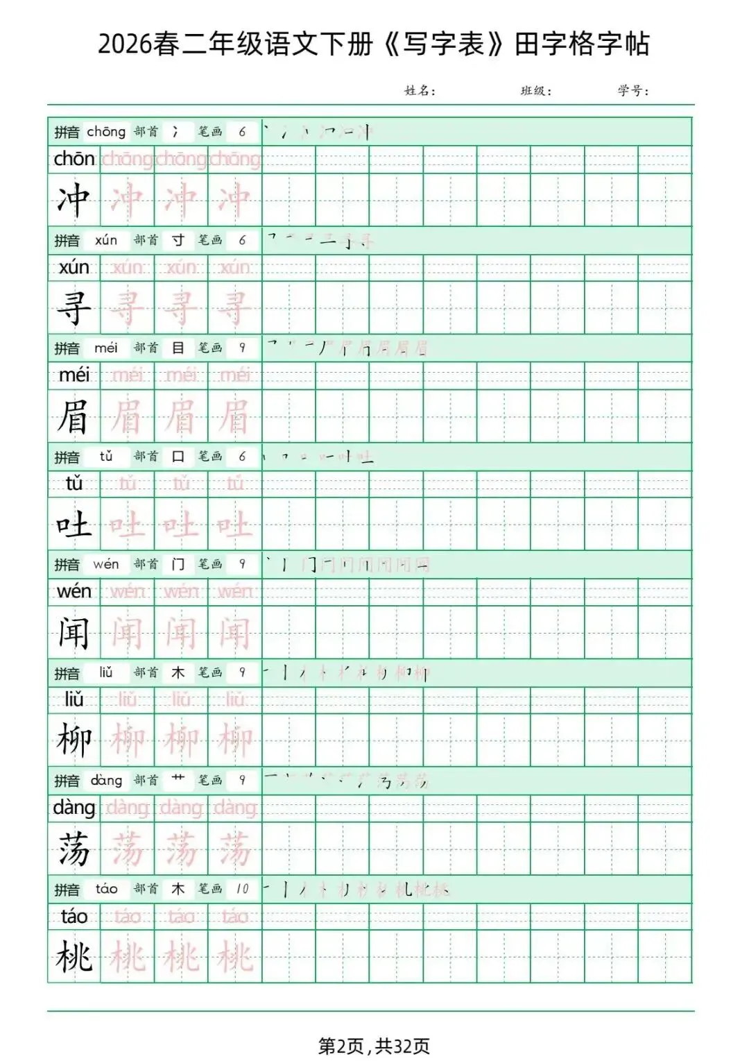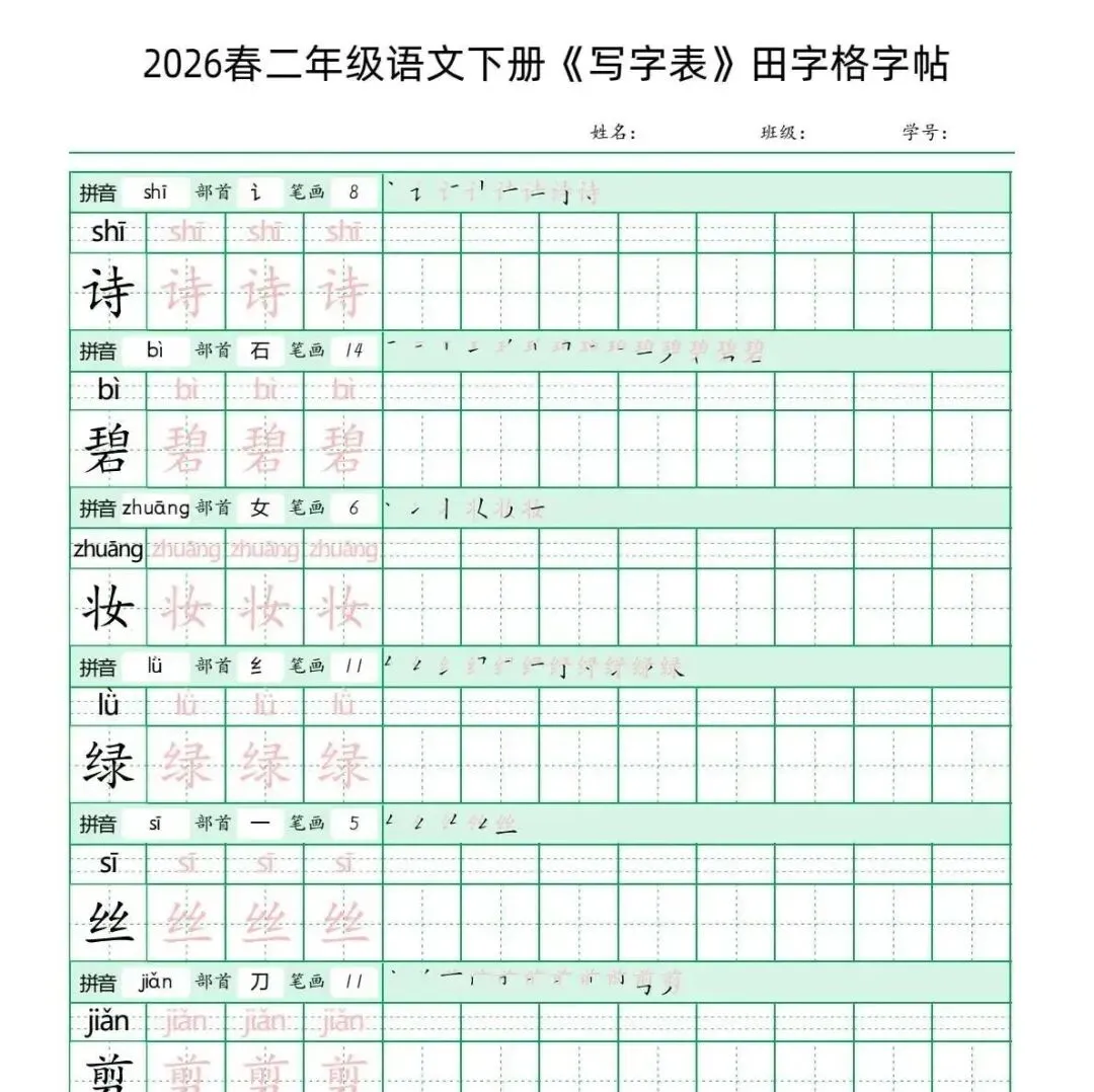 针对2026年新版二年级下册语文教材的变动,我们特别整理了这份全面的《写字表田字格字帖》,帮助孩子们提前预习和巩固生字。