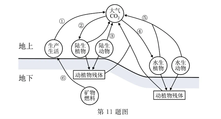 11.“碳达峰”是指某区域内CO₂的排放量达到历史最大值。为提前实现“碳达峰”的目标,从如图所示的碳循环路径进行分析,下列策略中最佳的是()