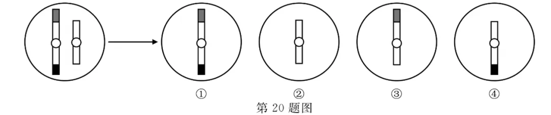 20.减数分裂过程中,同源染色体间每发生1次交换会形成1个交叉。在某原始生殖细胞中,观察到一对结构异常的同源染色体,其中一条染色体的两端分别带有来自其他非同源染色体的片段。若这对同源染色体的非姐妹染色单体间发生1次交换,该细胞产生的配子组合为①②③④,如图所示。
