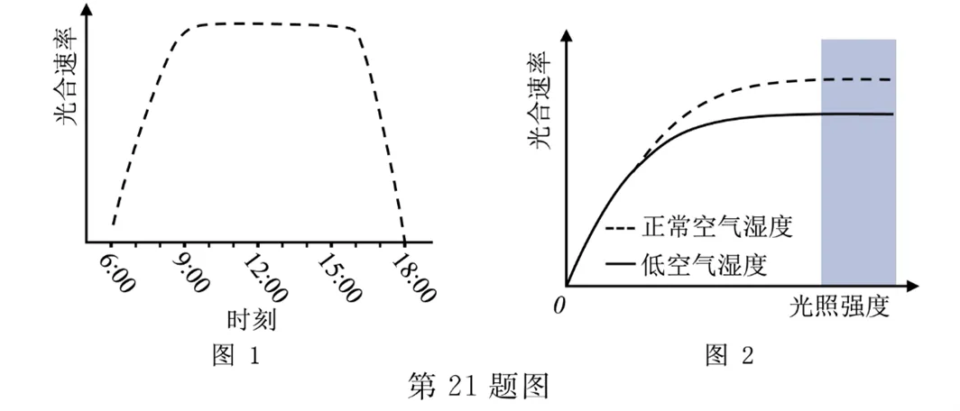 (1)研究人员发现,某稻田中有1株深绿色水稻突变体,其光合速率较其他的水稻高,可能的原因是突变体单位叶面积吸收的光能更______。该突变体光合速率变化如图1所示,6:00-9:00光合速率持续上升的主要原因是______(答出2点即可)。空气湿度对该水稻光合速率的影响如图2所示,图中灰色区域内,与正常空气湿度相比,空气湿度较低时水稻光合速率也较低,原因是______。