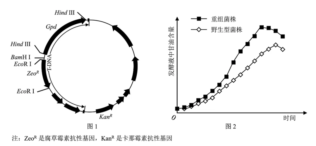 24.(12分)农杆菌能侵染真菌,介导真菌细胞的转基因。3-磷酸甘油脱氢酶是假丝酵母中甘油合成代谢途径的关键酶,将3-磷酸甘油脱氢酶基因(Gpd)构建到表达载体上,如图1所示。通过农杆菌介导法,转化假丝酵母野生型菌株,获得转Gpd的重组菌株。野生型菌株与某重组菌株分别进行发酵实验,生产甘油的结果如图2所示。