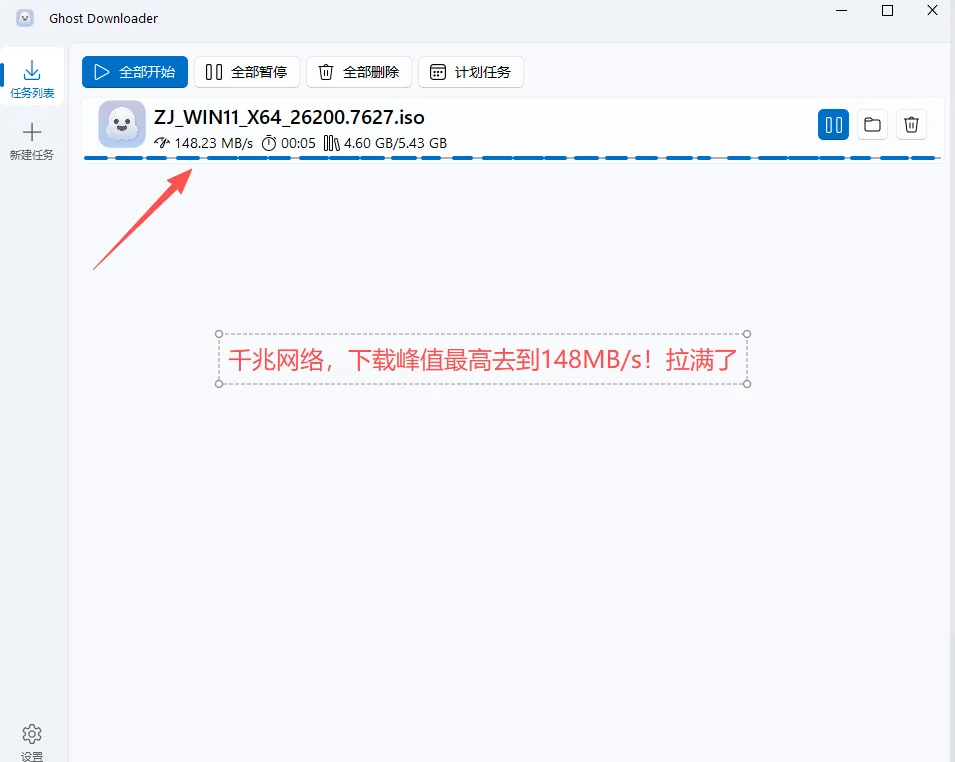 很多朋友之所以头疼下载,无非就是速度太慢,而这款软件支持多线程下载,最大可以设置到256线程,当然一般20线程就够用了,我家里的网络是移动千兆宽带,实测下载速度能轻松跑到100MB/s以上,最高峰值可以跑到148MB/s 直接拉满千兆宽带,5GB左右的大文件不到一分钟就能下完,这一步操作下来,能省去不少等待的时间,对于急着要资源的朋友来说,绝对是神器。